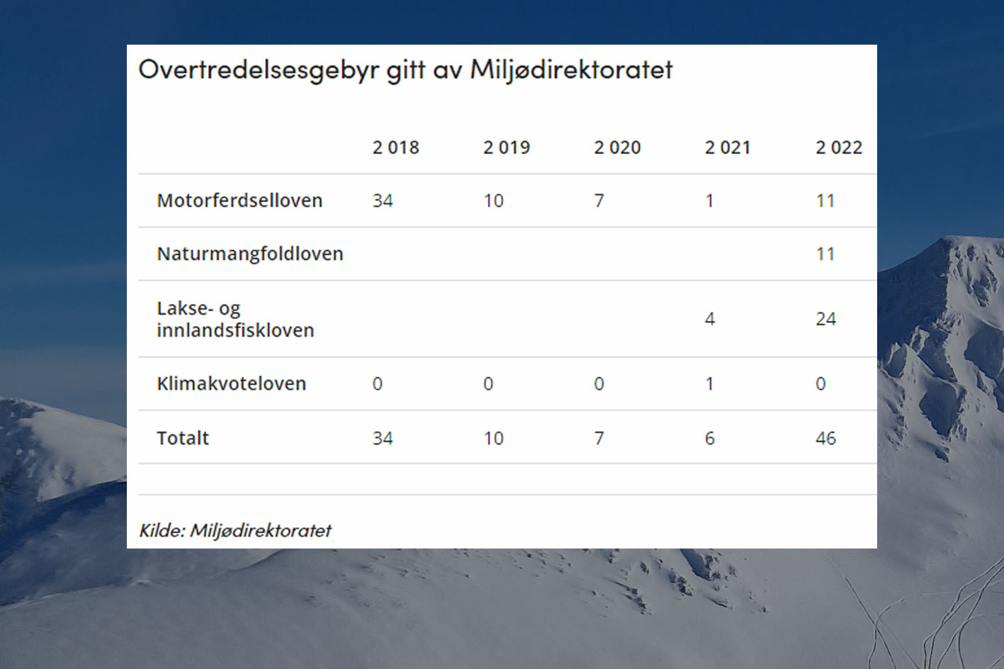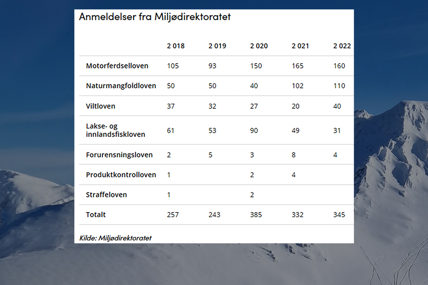 I 2022 leverte Miljødirektoratet 345 anmeldelser til politiet. En av fem kontroller av motorferdsel fører til anmeldelse.