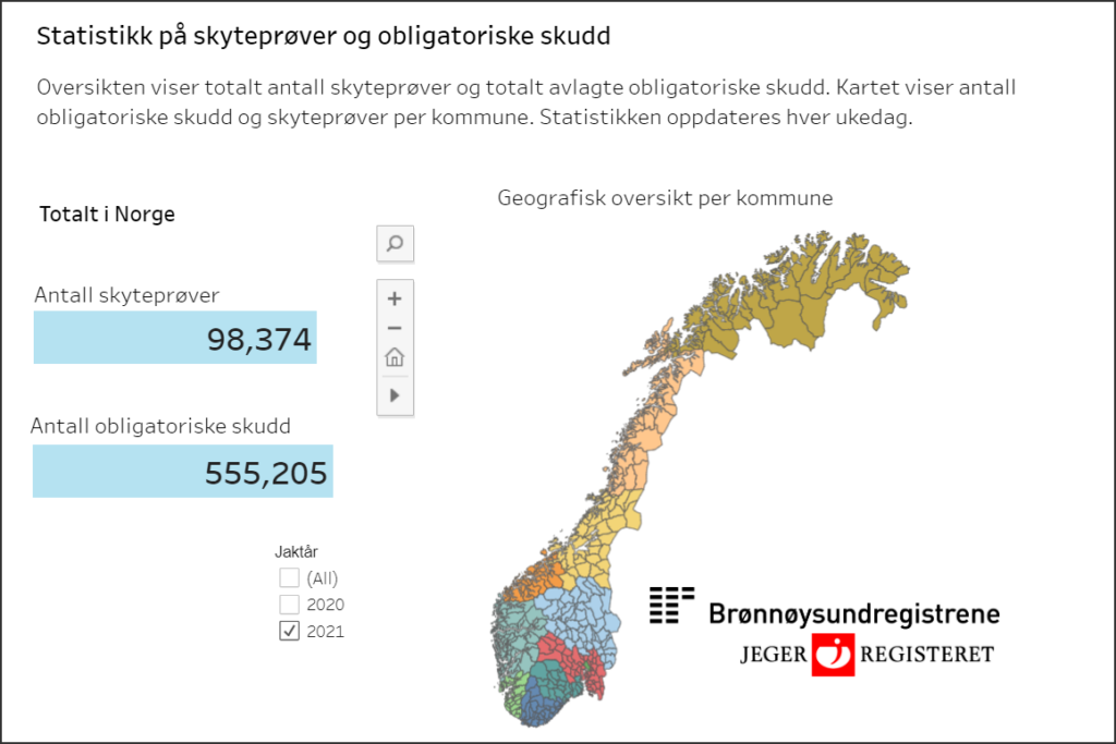 Statistikken viser kun skyting som er dokumentert digitalt ved bruk av app på skytebanen. Miljøverndirektoratet har ikke tall for de jegerne som bruker vitnemål på papir for å dokumentere skyteprøve.
