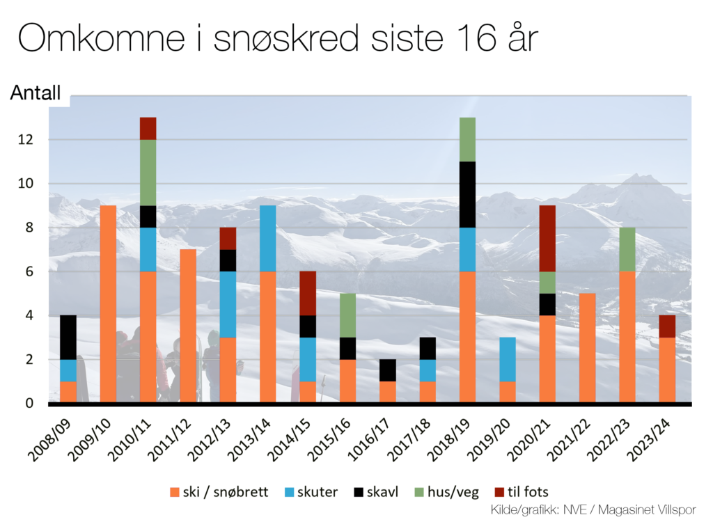 Det var tre menn og en kvinne som døde i skredulykker vinteren 2023-2024. Alle fire var nordmenn. Statistikken viser at 58 prosent av de omkomne i ulykker på skitur i Norge etter 2008 er nordmenn.