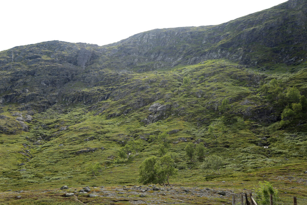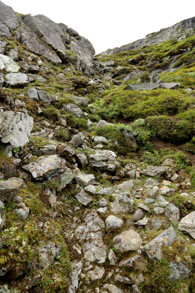 Sjekk kartet nøye og finn riktig renne, denne går svakt på skrå nord/nord-vestover før den dreier mer direkte nord. Det er ingen sti her, men terrenget er tydelig på hva man bør velge. All ferdsel her er på eget ansvar. Ta det med ro og gjør gode vurderinger.