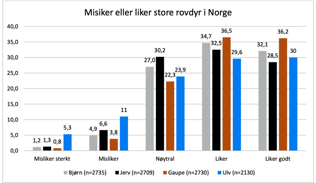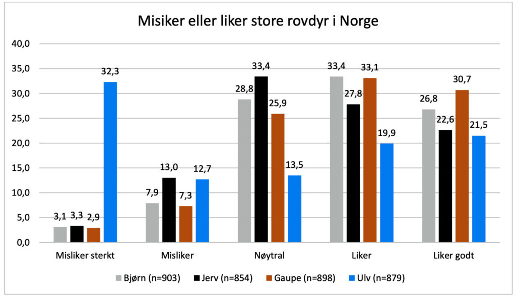- Ulv er det store rovdyret flest misliker. 16 prosent oppgir at de enten misliker eller misliker sterkt at vi har ulv i Norge. En av tjue oppgir til og med at det misliker det sterkt.
