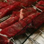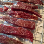 - Legg strimlene luftig på rist i et svalt rom i noen dager – med litt avstand mellom kjøttet. Vendes en gang i døgnet eller noe slik. Dekk over med myggnetting eller tilsvarende.