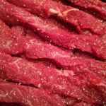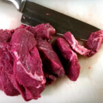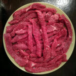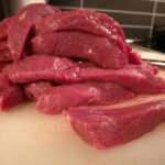 - Skjær kjøttet i strimler, i tykkelse på opptil 1 centimeter (sånn omtrent).