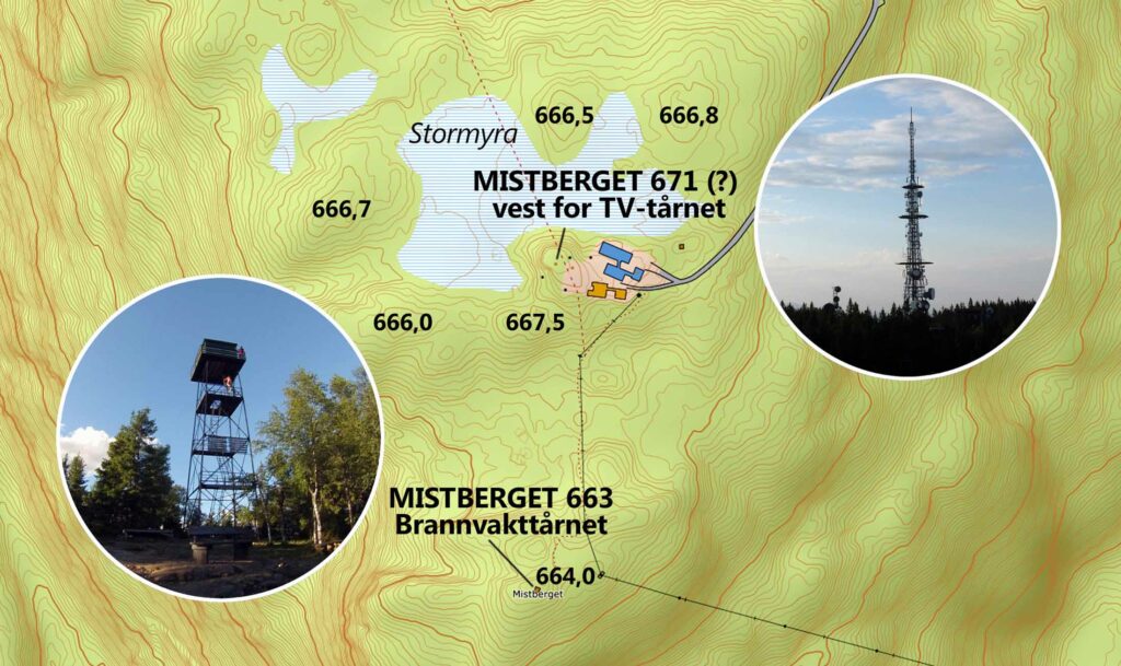 – Grunnen til høyden 663 meter over havet for Mistberget, er nok at det er anvendt høyden på det trigonometriske første ordenspunktet G33T0020 (for de spesielt interesserte. Red anm), som er å finne rett under branntårnet. I sin tid var dette den mest pålitelige høyden på dette fjellet. Det er det for så vidt i dag også, men nå har vi bedre grunnkart tilgjengelig, sier Espelund.