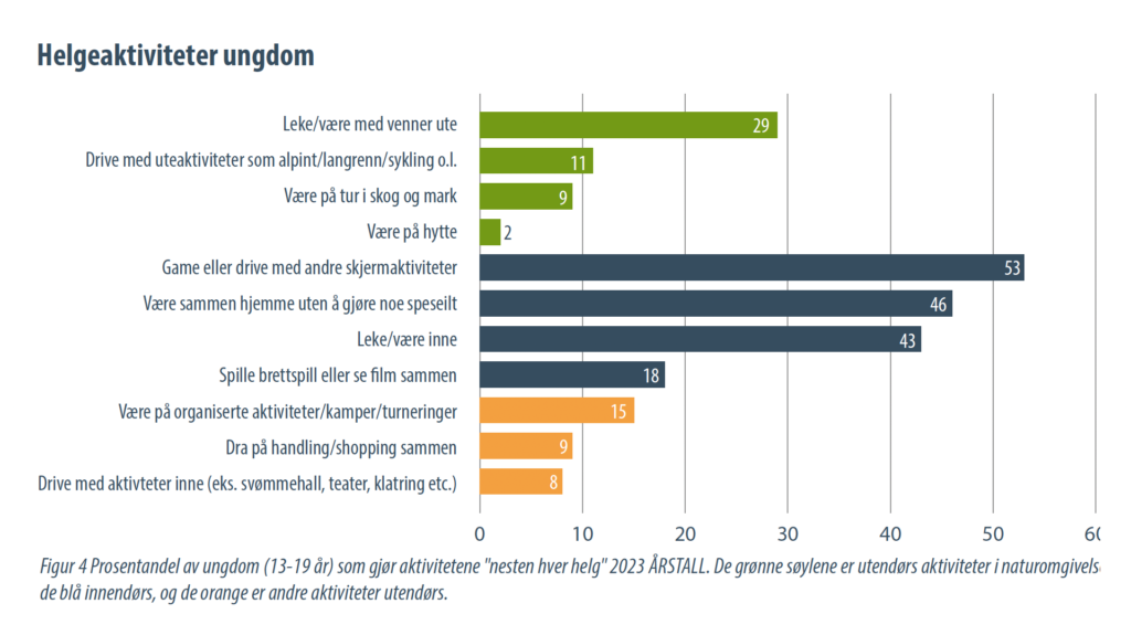Fremdeles leker 3 av 4 barn utendørs ofte, og omtrent halvparten av barna er ukentlig ute på egenhånd. Tidligere studier har vist at det særlig er den frie leken uten voksne til stede det har blitt mindre av.