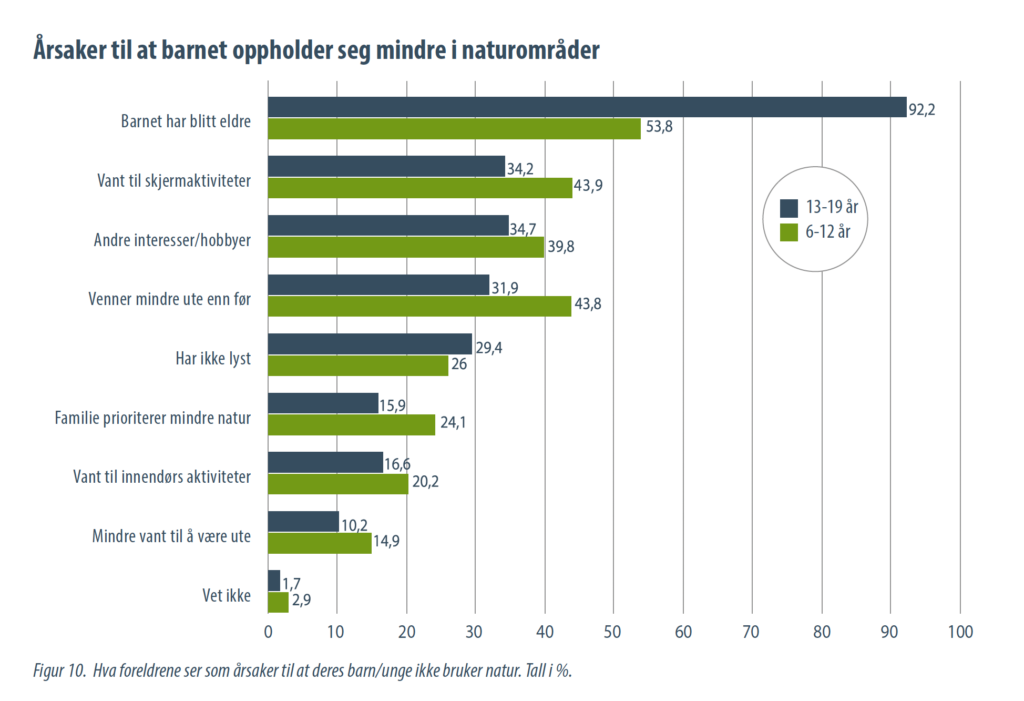 Samtidig viser studier at tilrettelagte områder i nærmiljøet blir mer brukt enn natur, og at barns kontakt med naturen i stadig større grad foregår i barnehage, skole, SFO og i ulike organiserte former.