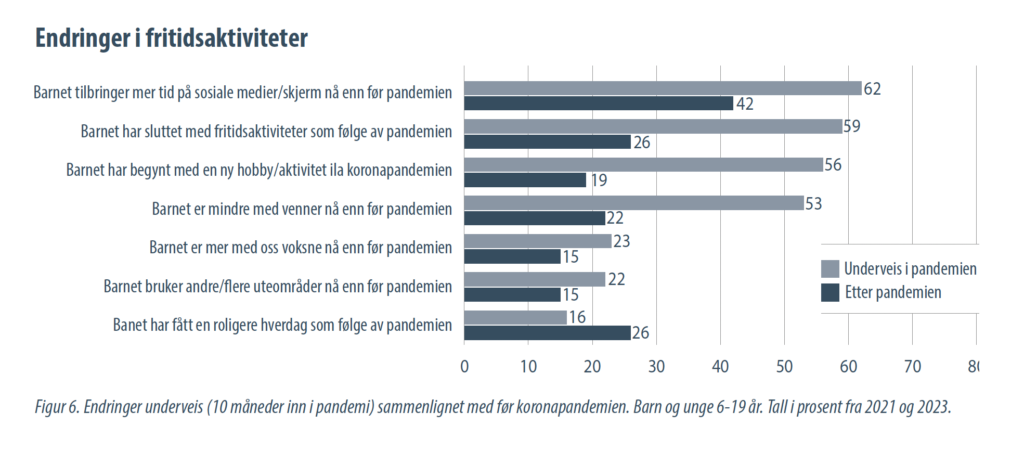 Studien viser at pandemien medførte store endringer i barn og unges bruk av fritiden sin. Barna brukte mer tid på skjerm og var mindre sammen med venner.