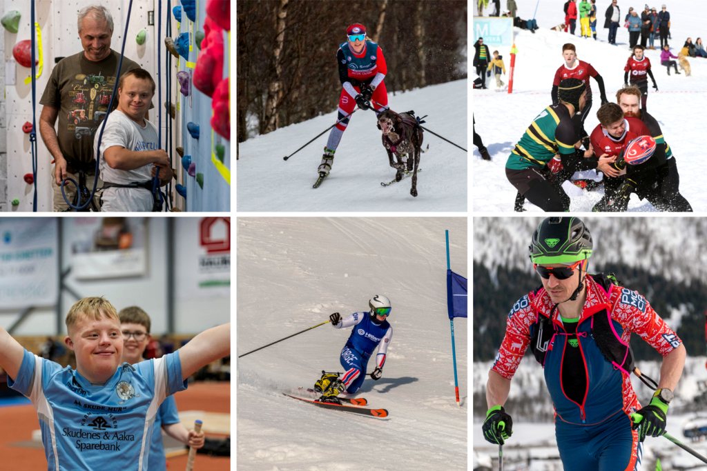 Klatring og innebandy for utviklingshemmede, hundekjøring, snørugby, telemark og randonee er noen av idrettene vi vil se på Lillehammer i mars. Bilder/collage: NIF/pressemelding