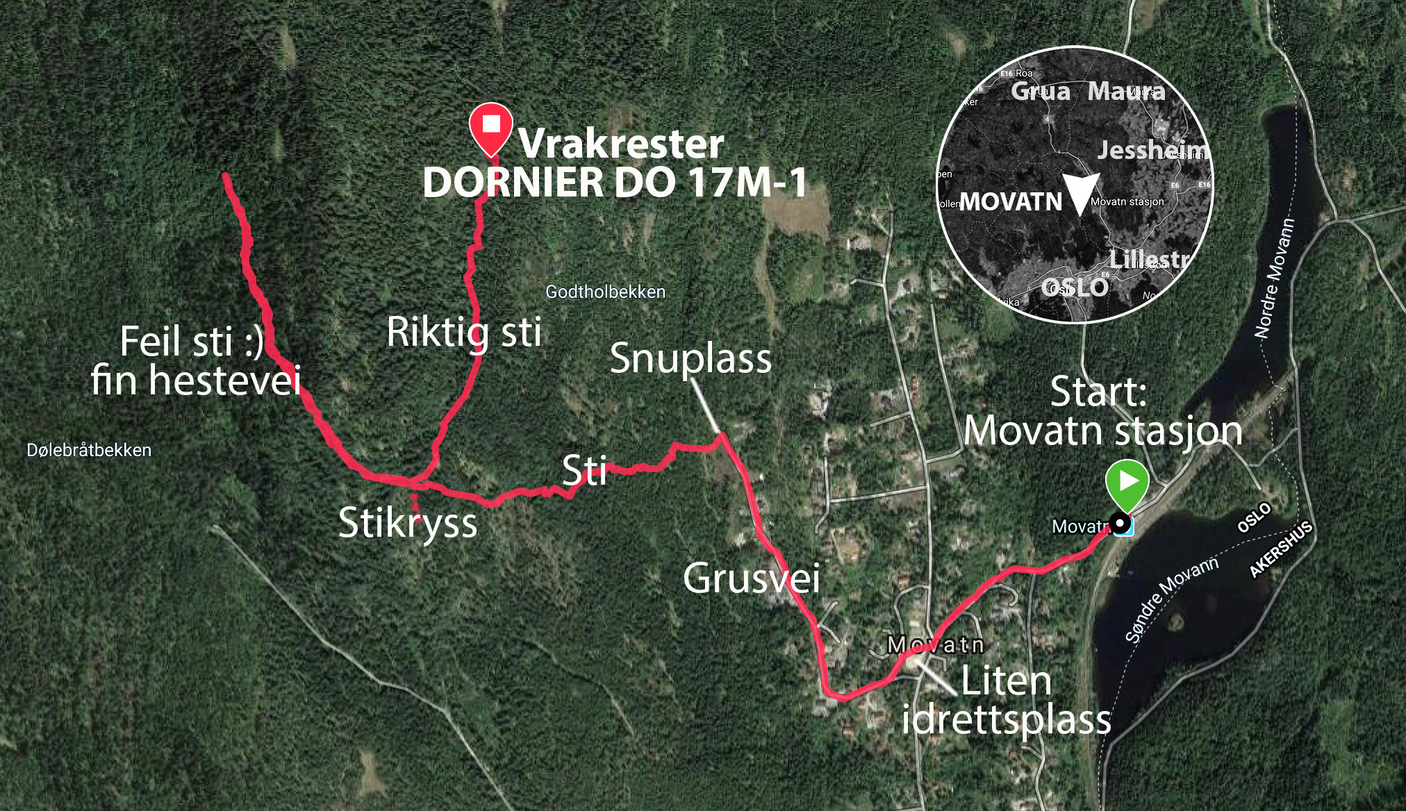 • Utgangspunkt: Movatn stasjon (271 moh.) langs Gjøvikbanen i Nordmarka/Maridalen. Følg Movassbakken/Sørbråtveien på asfalt over i Rundmyrveien (grusvei), til enden. Sti vestover, ca 7-800 meter til stikryss, ta sti til høyre (rett nordover), og følg denne cirka 6-700 meter rett nord. Vrakrestene ligger inntil stien, rett etter du runder en myr. TIPS: Les teksten over. Det er lett å gå feil. Får du fjellveggen på din høyre side på vei innover stien er du på villspor.