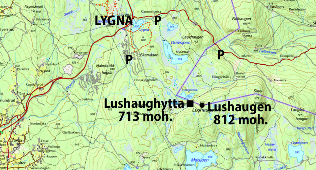 Hytta ligger ved foten av Lushaugen, hvor det nylig er satt opp et nytt tårn. Tårnet står på grensa mellom Oppland og Akershus, mellom kommunene Gran og Hurdal.