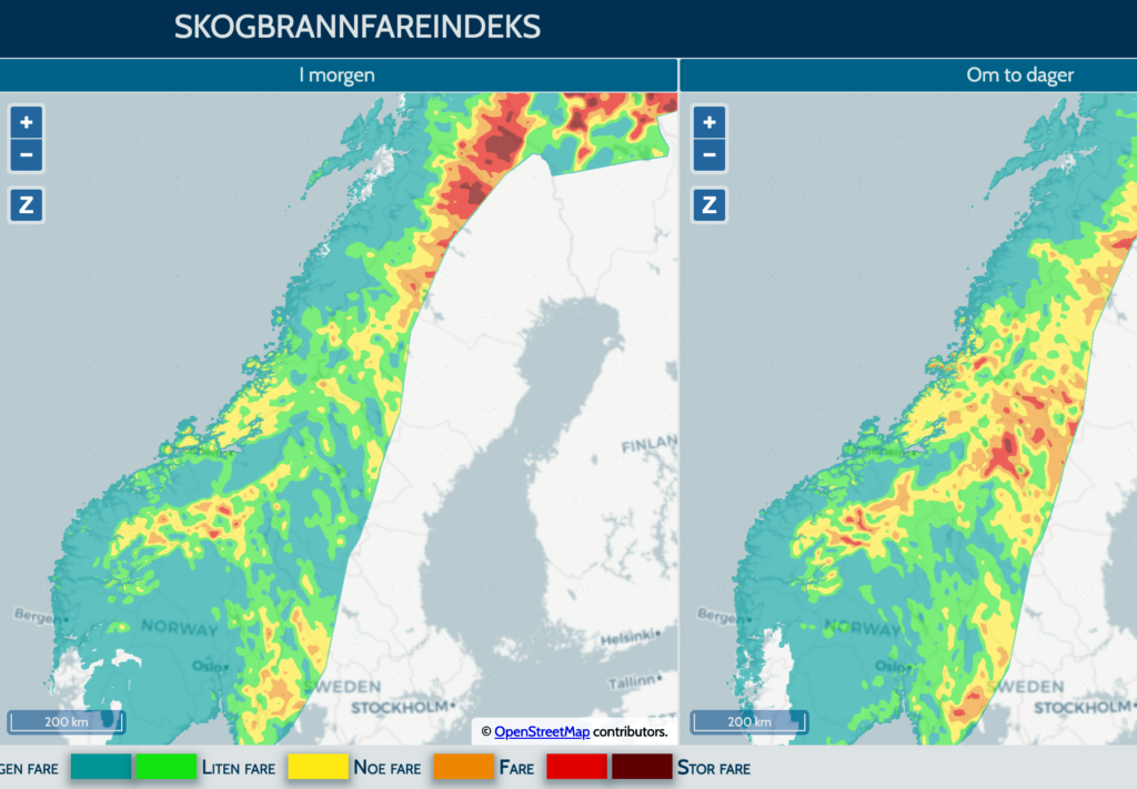 Ved hjelp av finansiering fra Direktoratet for samfunnssikkerhet og beredskap (DSB) har Meteorologisk institutt laget en ny skogbrannfareindeks for Norge. Denne indeksen gir en indikasjon på hvor det kan være forhold som gjør at en skogbrann kan starte og hvor fort denne kan spre seg.