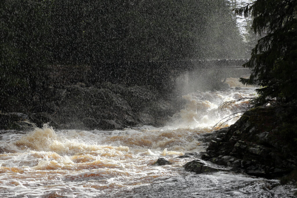 Vårflom med stor vannføring i Øksna, elva som renner gjennom Korpreiret.
