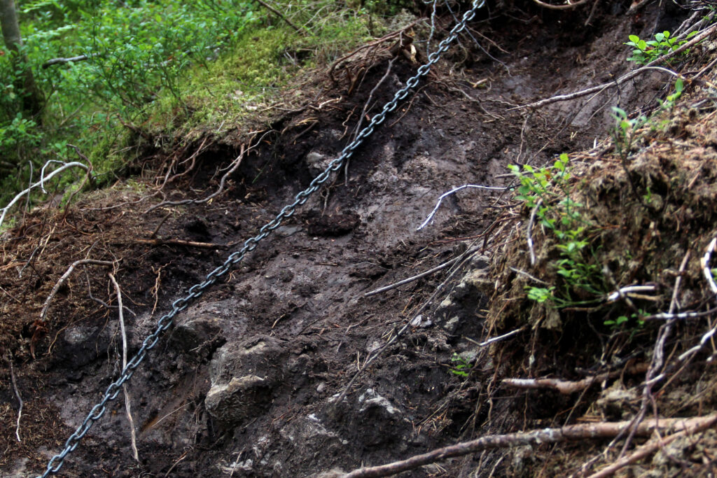 Sikret med kjetting: Stien ned til nedre fossefall er bratt og litt vanskelig. De mest krevende partiene er sikret med kjetting, så er det mulig å holde fast på vei ned – eller opp.