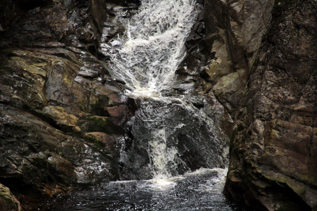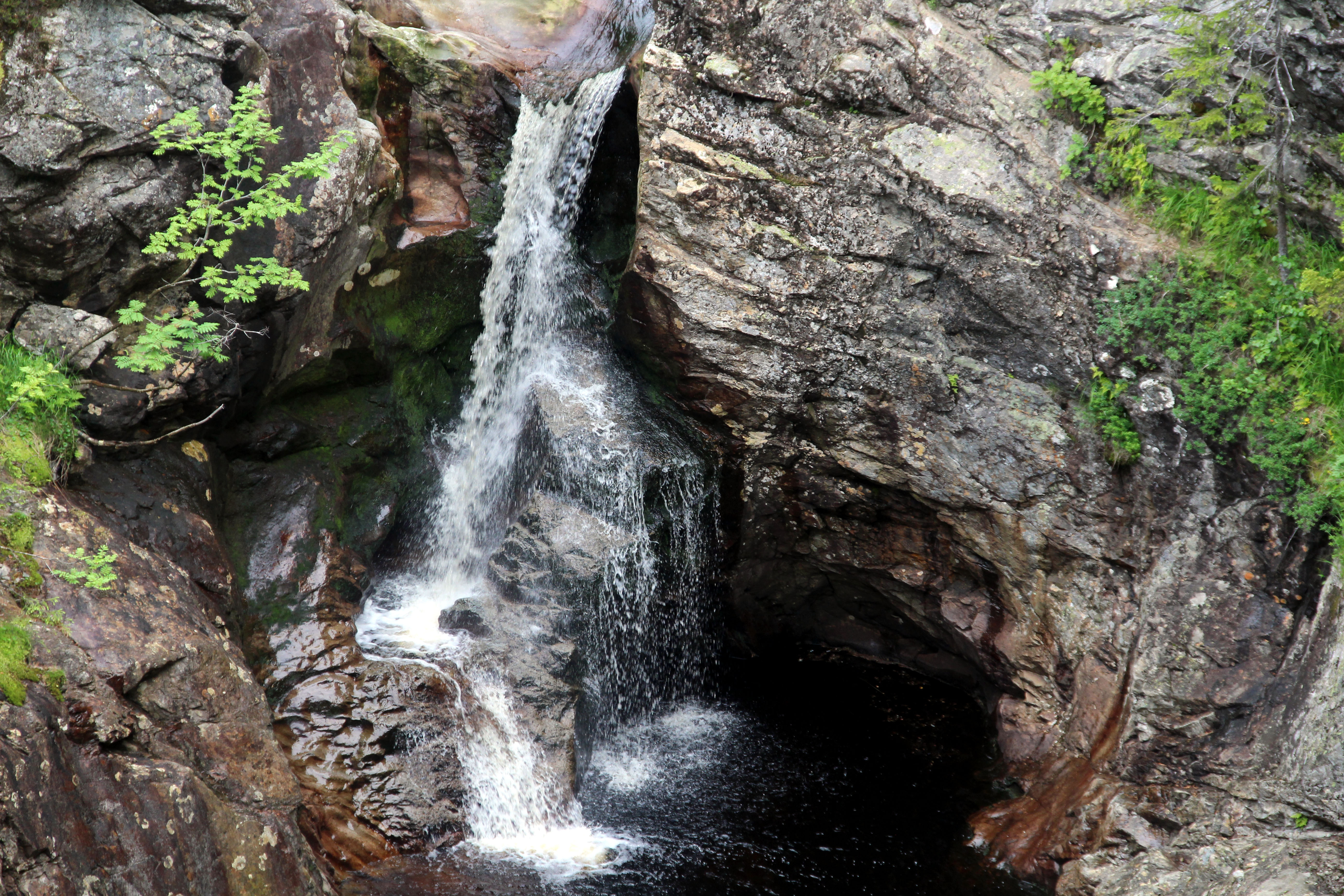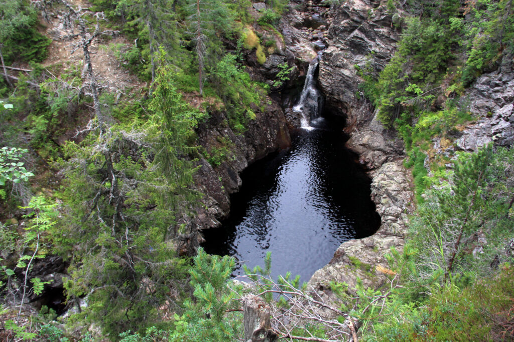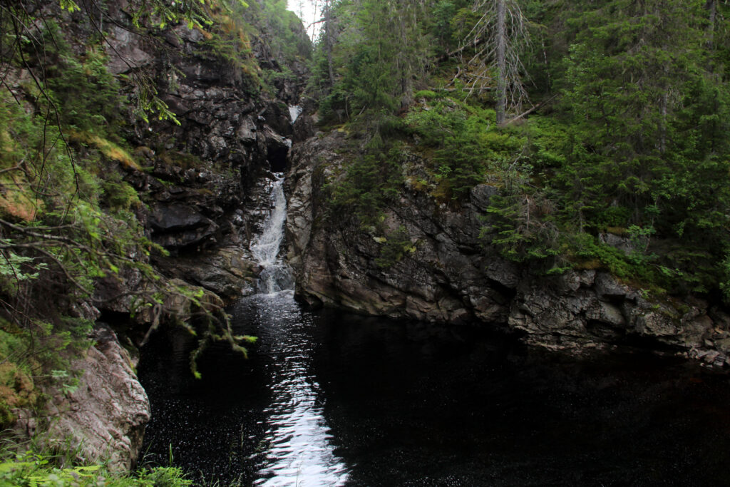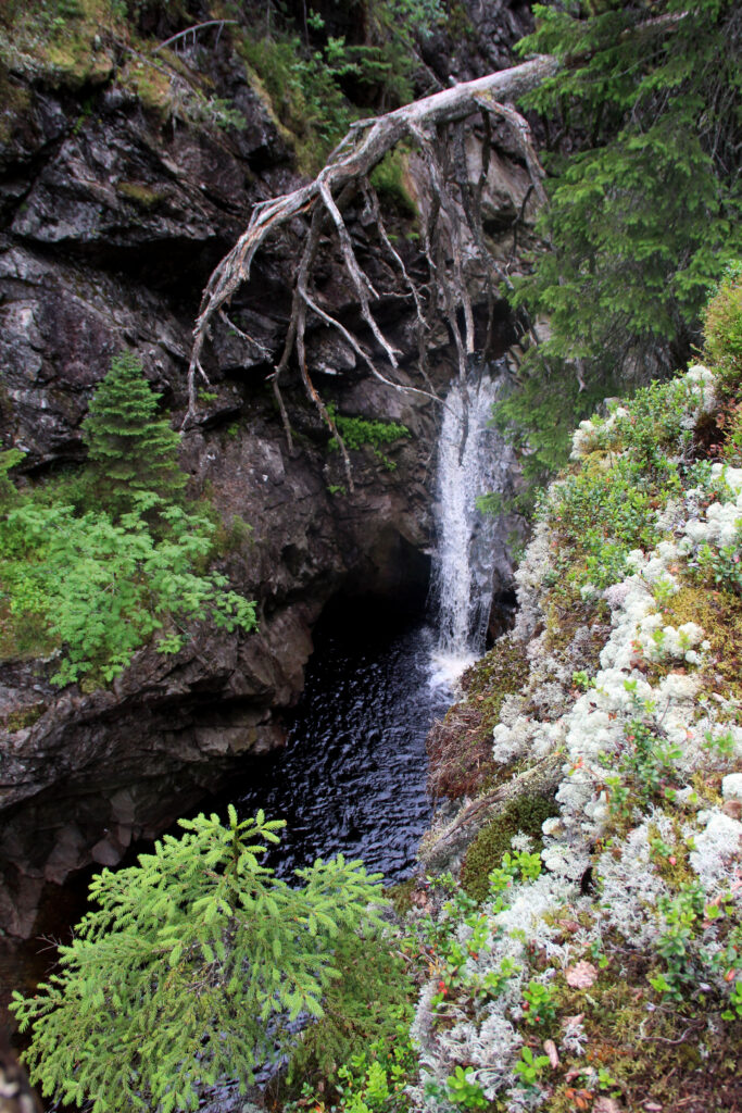 Første, eller øvre fossefall er kun noen hundre meter fra utgangspunktet for turen. Bildet er tatt fra stien på sørsiden av juvet. Legg også merke til jettegryta nede i juvet.