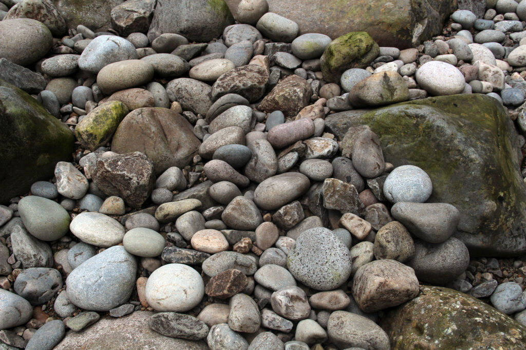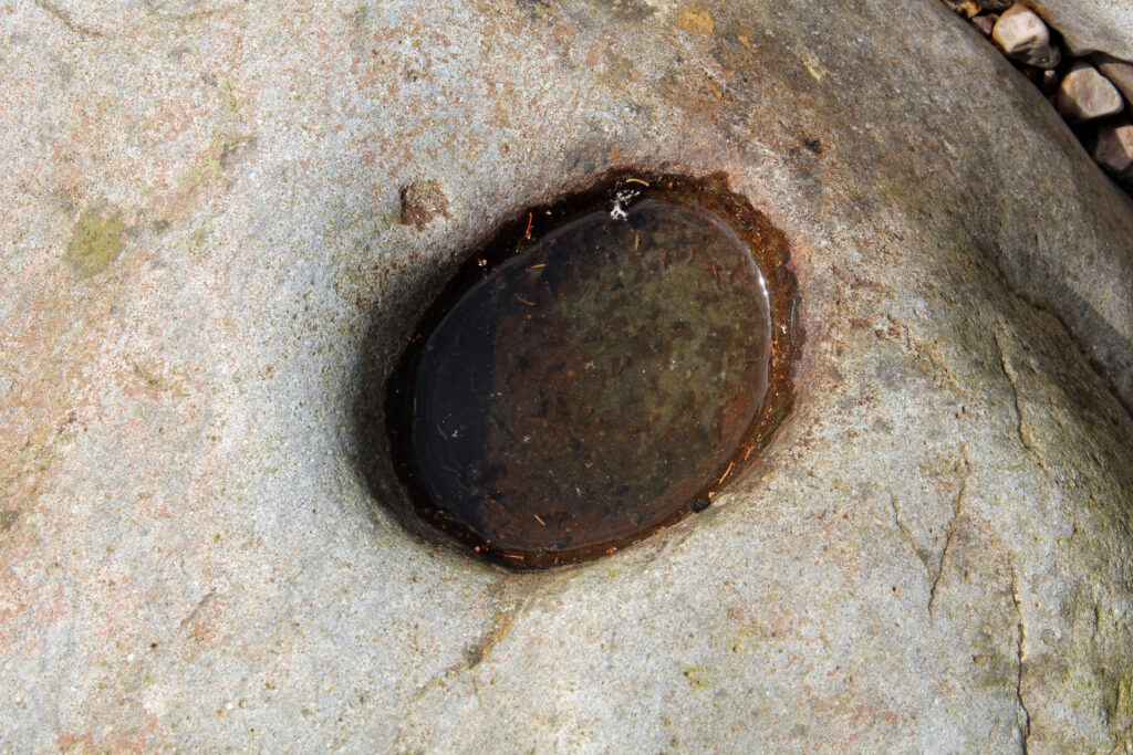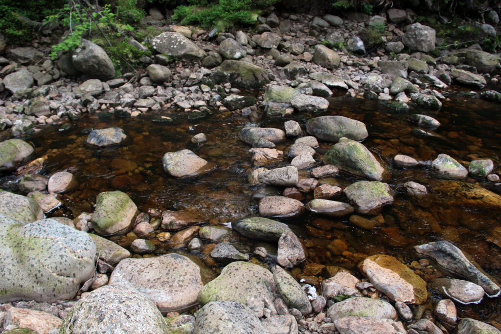 Steinen i bunnen av juvet er eksponert ved lav vannføring. Steinen er slipt og avrundet av vannmassene over tid.