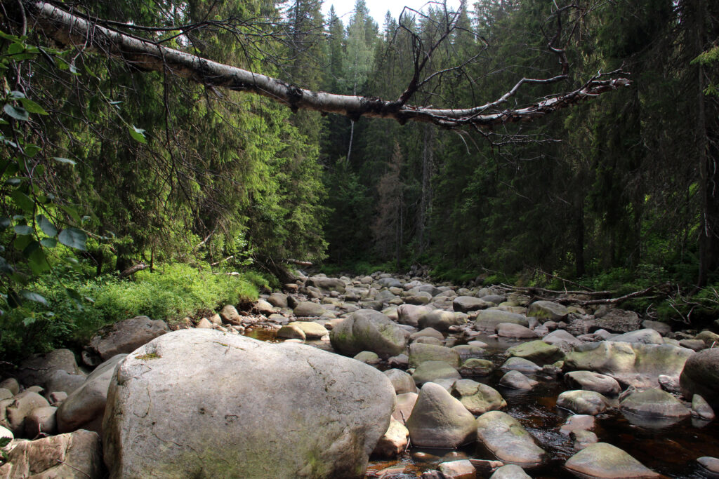 En varm og tørr sommer gir lav vannstand, og gode muligheter for å utforske elva nede i juvet. Her fra utgangspunktet for rundturen.