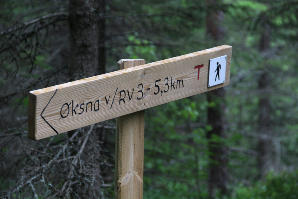 Skiltet fra navnløs vei er slitt og delvis skjult i vegetasjonen på stedet, men søket «Korperud, 2340» i Google Maps gir treff på parkeringsplassen, som er utgangspunktet for turen fra vest.