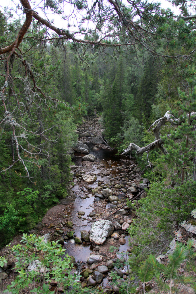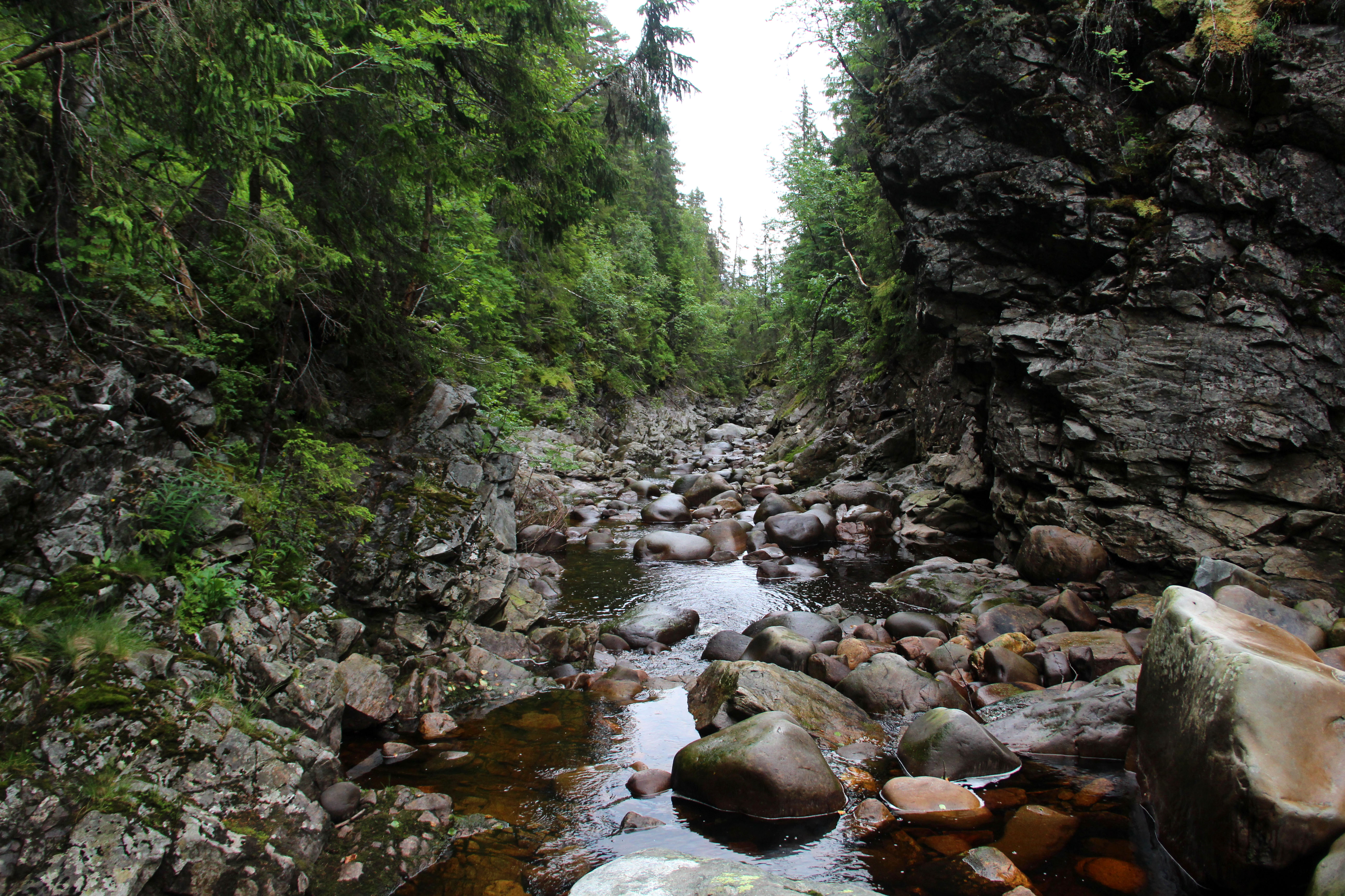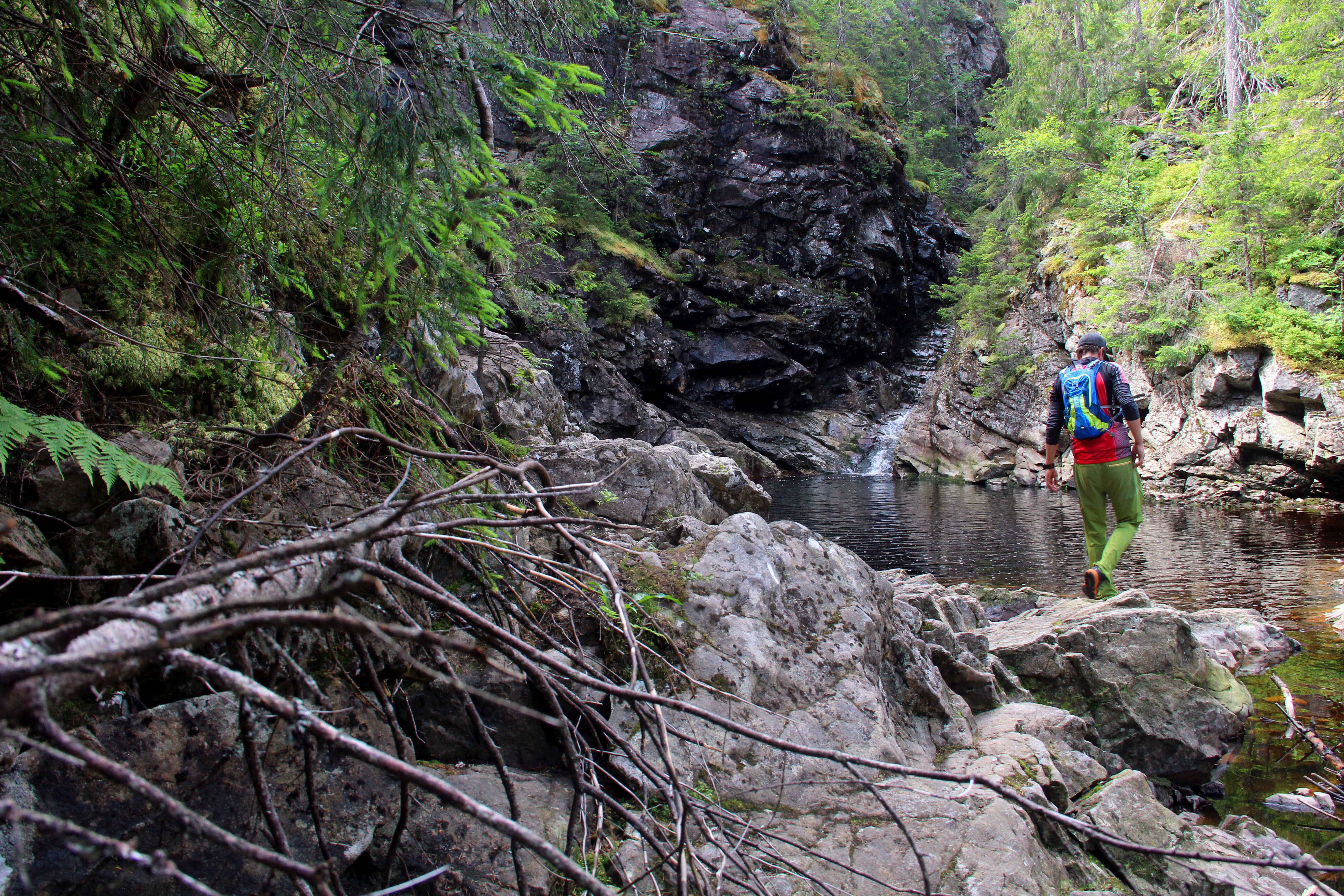 FRA BUNNEN AV JUVET: I bunnen av juvet: På tur nede i Korpreiret, mellom øvre og nedre fossefall et sted. Det er ikke alle steder det er mulig å komme ned, men enkelte steder er det mulig å følge tråkket eller stien helt ned i bunnen av juvet.