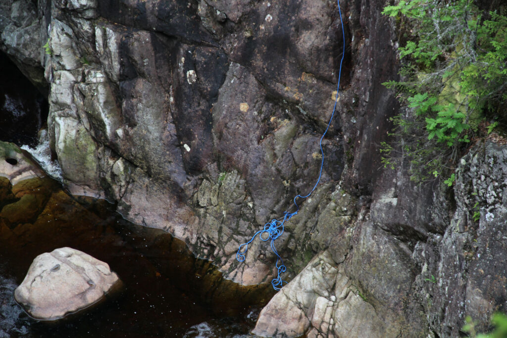 Det er flere badekulper i Korpreiret, om dette tauet i krevende terreng ved øvre fossefall er montert for lek eller annet er uvisst. Tips; styr unna.