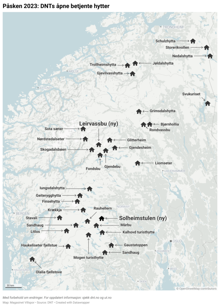 Den norske turistforeningen åpner flere hytter denne påsken. Her er det muligheter enten du vil på topptur, gå i kvistet løype eller kose deg inne på en av hyttene, mer informasjon og lenke til hyttene under kartet.