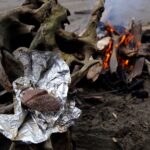 Kjøttet forbereder du hjemme – og behandler etter egen smak: Marinér det en dag i forveien eller krydre med det du ønsker. Pakk det godt inn i et par lag med folie sammen med godt smør. Husk at varmen i bålet er noe ujevn og vanskelig å kontrollere. Litt tynnere skiver kjøtt kan være enklere å håndtere om det skal spises som fingermat rett fra folien.