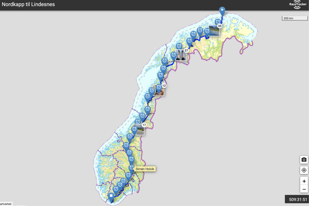 – Fallhøyden er stor. Den 1. juli begynner jeg å løpe fra Nordkapp-platået. Innen 30 dager er planen å ta på Lindesnes fyr. Total distanse er omkring 2600 kilometer. Lengste etappe blir 127 kilometer og korteste 69 kilometer, meldte Simen Holvik på sin nettside før start.