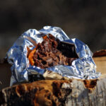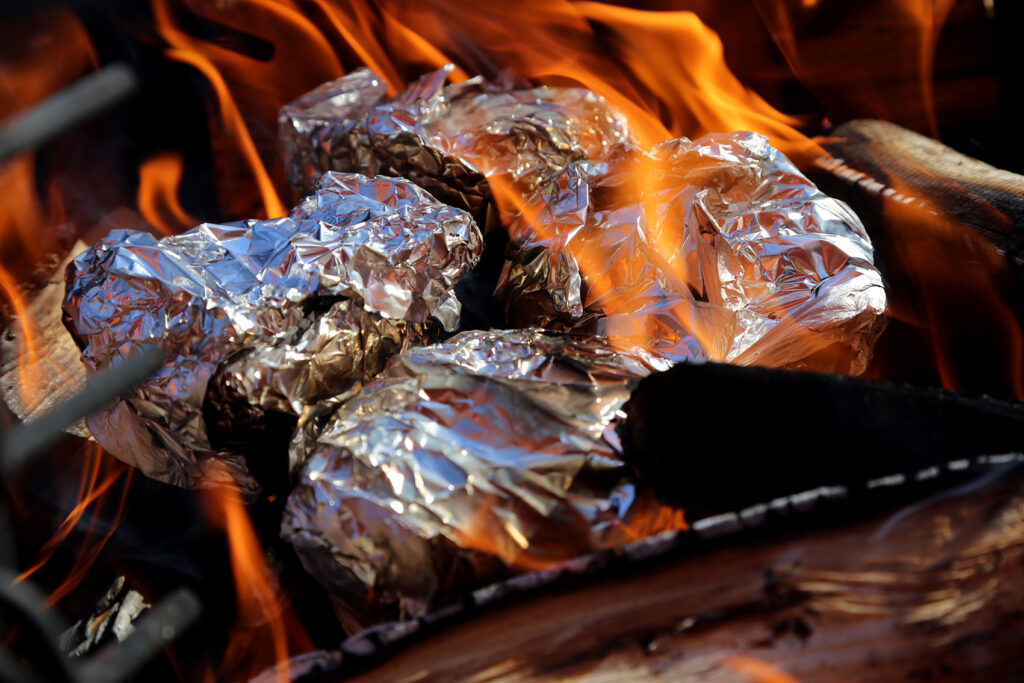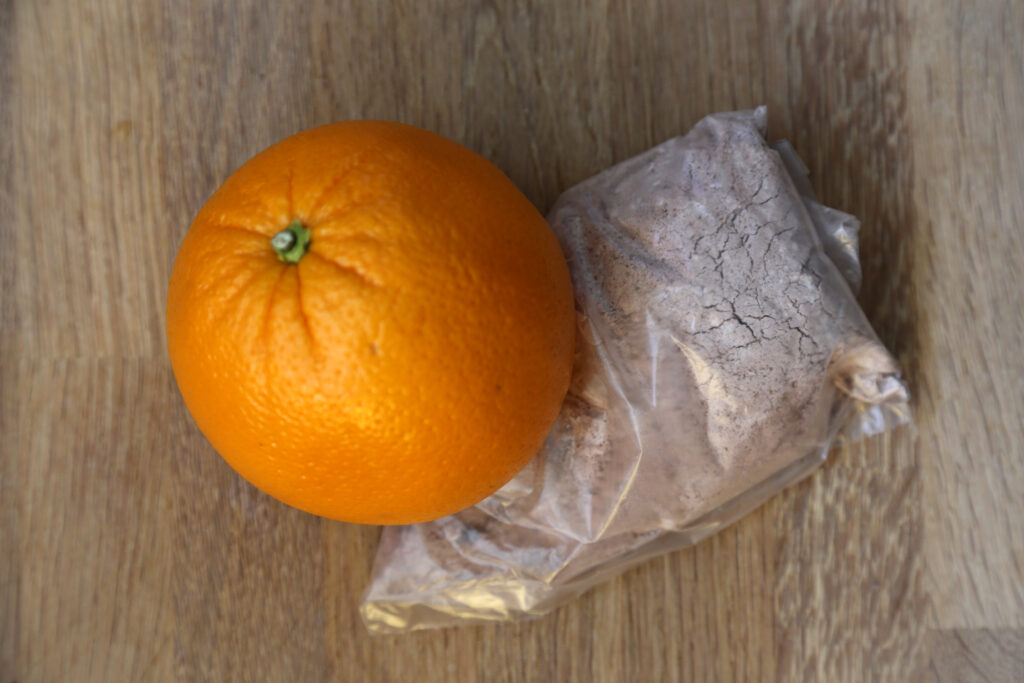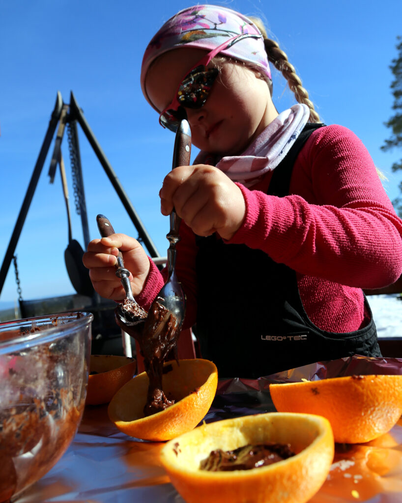 Deretter tar du fram posen med «kakemiksen» og blander denne i vann, fyller de halve apelsinskallene, pakker dem i folie og legger dem i bålet. Tilberedning er alt fra 10-15 minutter til mye mer, alt ettersom mengde fyll i appelsinene og varmen i bålet.