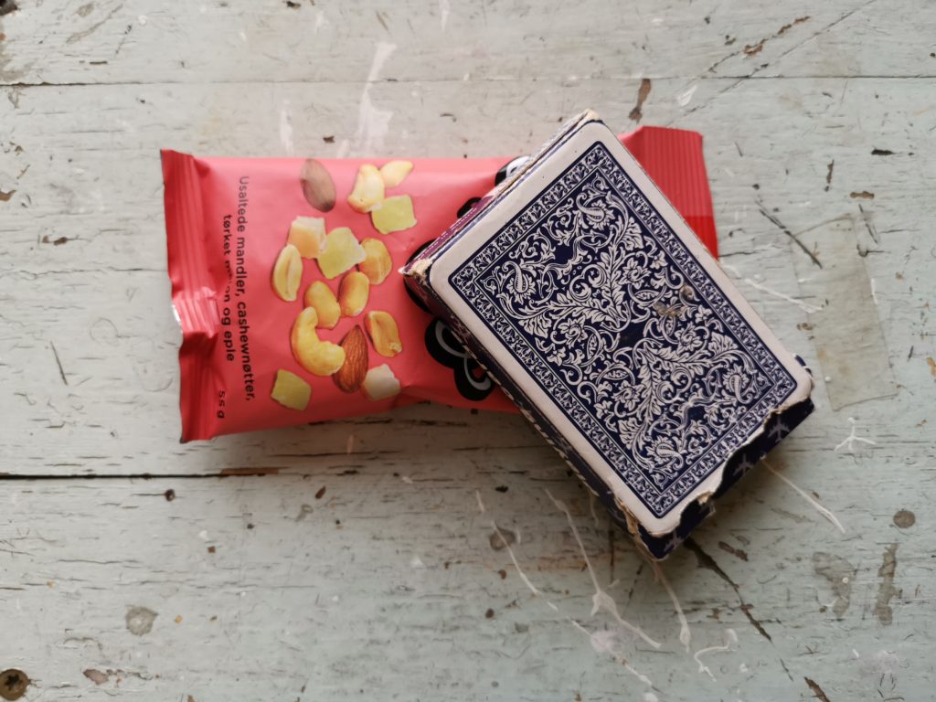 VEKT: 50-100 gram? (pose nøttemiks 55 gram, populær tursjokolade 47 gram, kortstokk 90 gram)