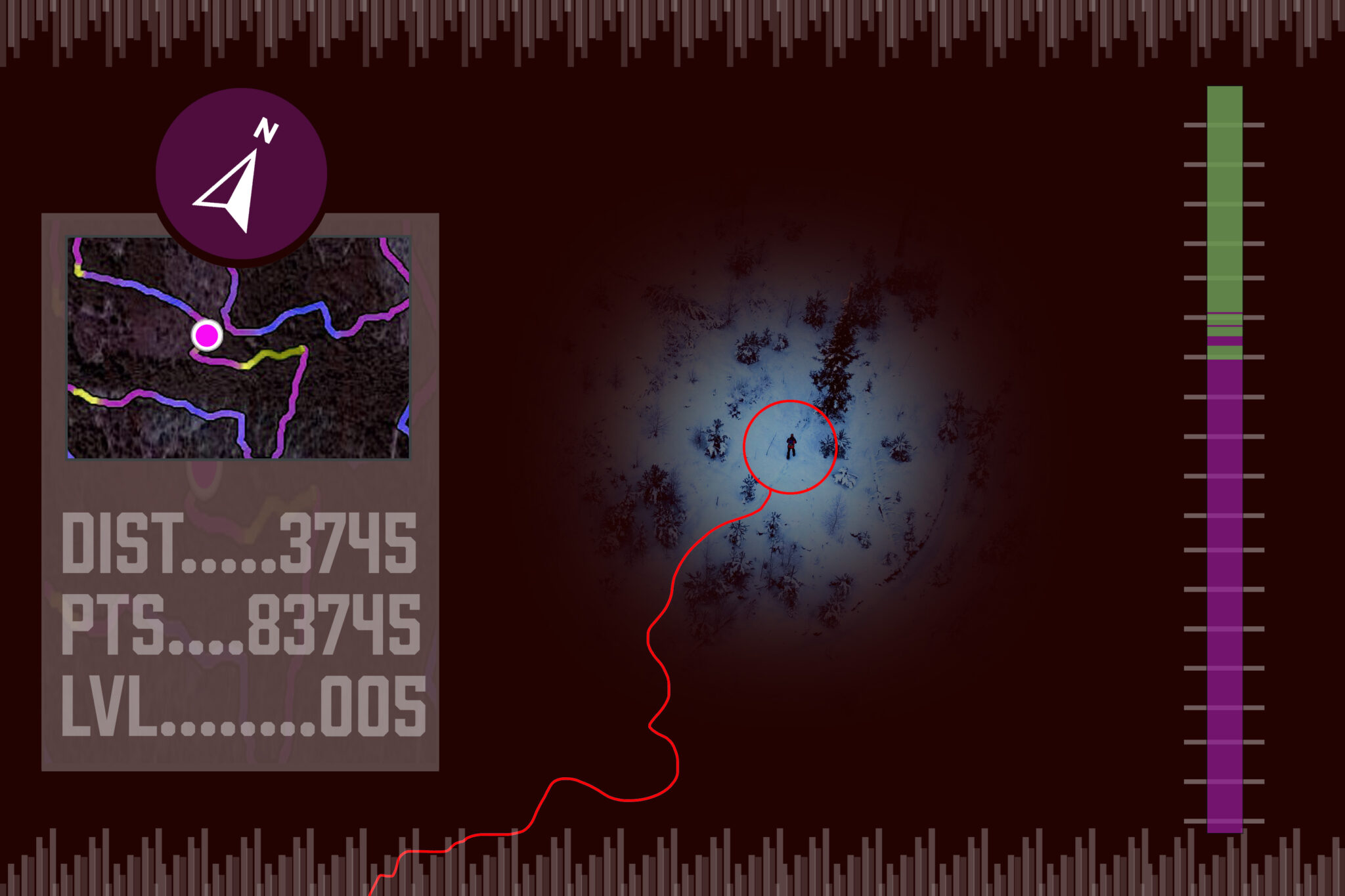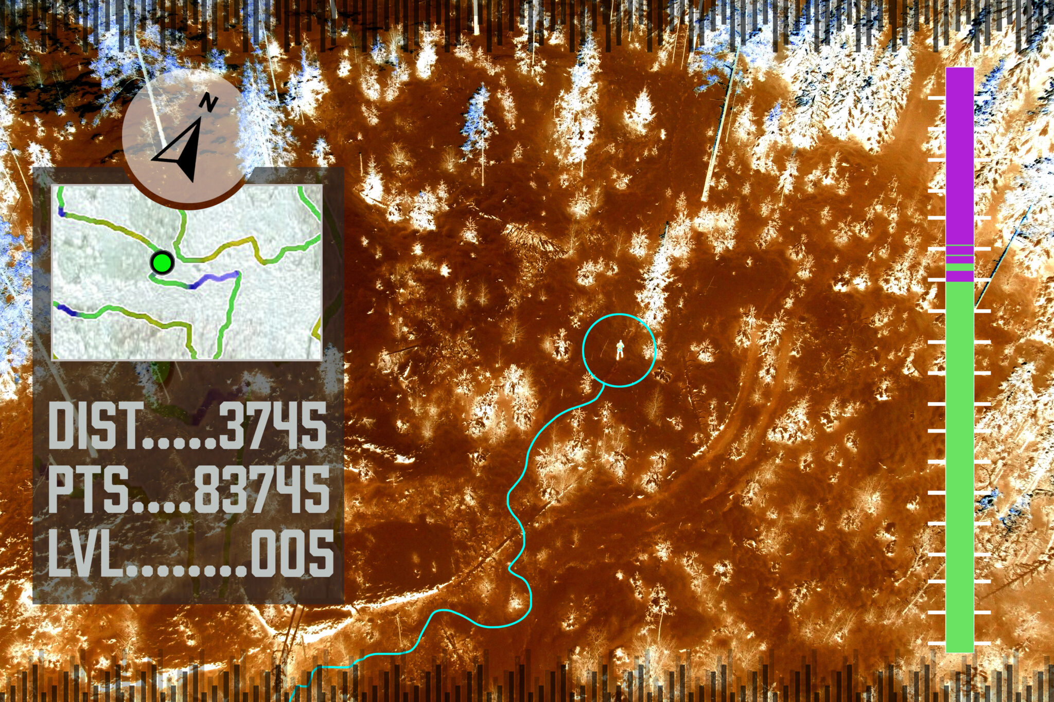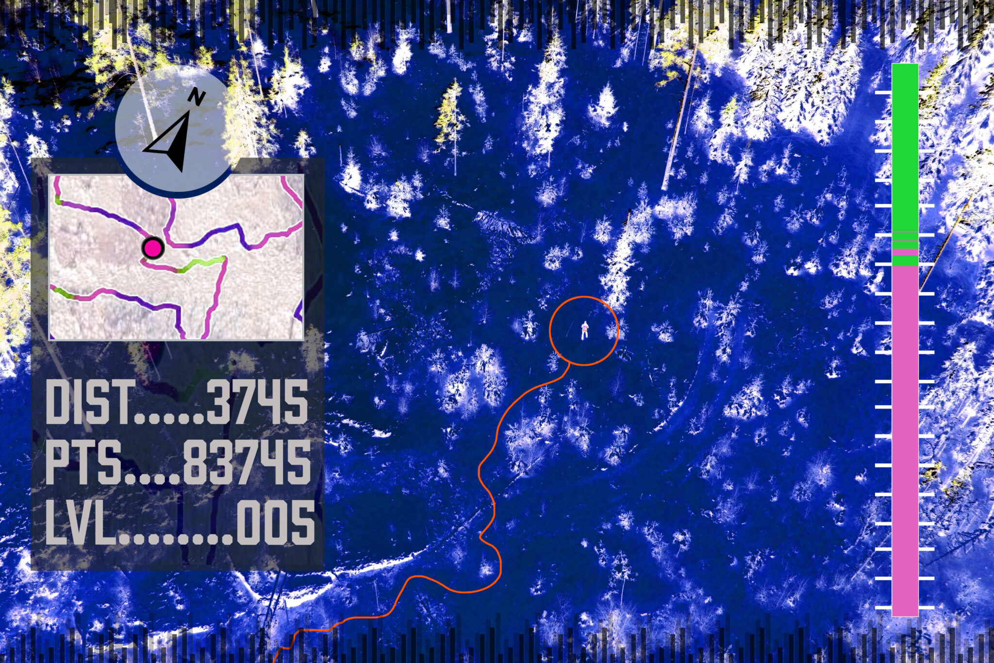 Rolige steg, jevn pust. Frostrøyken fester seg. Rimet sitter i øyenbryn og skjeggstubber. Det knitrer i knuste iskrystaller. Klokkens gps viser 9,2 kilometer. Et blikk på det provisoriske kartet. Rett frem i neste stikryss. Så mål. Kan det holde? Er det 800 meter tilbake til utgangspunktet?