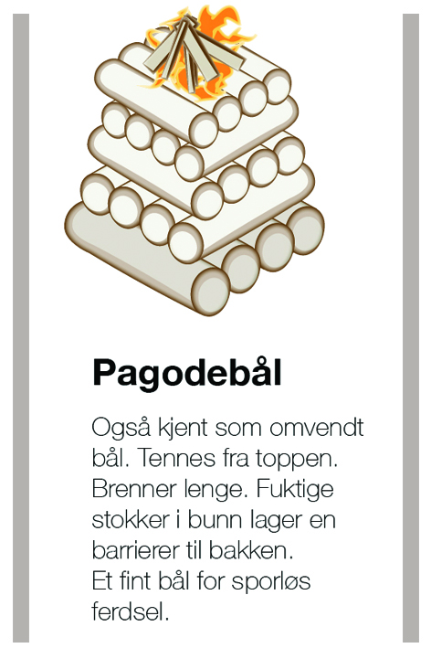 - Pagodebål – brenner lenge og sporløst: Lag en kvadratisk base av fuktige vedkubber – og bygg lagvis opp i høyden med tørr ved. Fire-fem lag. Litt mindre vedkubber øverst – og tenn på fra toppen. Bålet brenner lenge og brenner seg nedover – og gir lite spor da de fuktige vedkubbene nederst skåner bakken. Et bra valg for sporløs ferdsel.