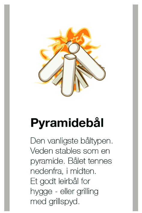 - Pyramidebål – et leirbål for hygge: Den vanligste båltypen. Start med småved og never. Stable større pinner eller kubber som en pyramide rundt. Tennes nedenfra. Passer dårlig til matlaging med kjele eller stekepanne, men fungerer bra med grillspyd eller mat pakket i folie.