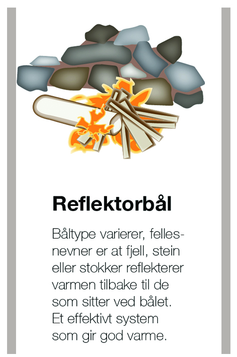 - Reflektorbål – varmt og godt: Brukes med flere typer bål. Ideen er å ha en større stein/flere steiner – eller fuktige stokker eller kubber som reflekterer varmen fra bålet til dem som sitter foran det. Et effektivt system som gir god varme.
