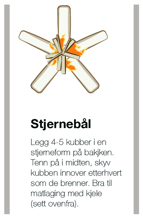 - Stjernebål – effektivt til matlaging: Legg 5-6 kubber i en stjerneform flatt på bakken. Tenn et lite pyramidebål i midten. Når pyramidebålet brenner ned får du en flat base for en kjele eller stekepanne. De store kubbene i stjernen skyves inn mot midten av bålet etterhvert som de brenner. Bålet trenger lite ved og passer godt til matlaging. Bålet gir lite kos og varme.
