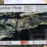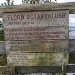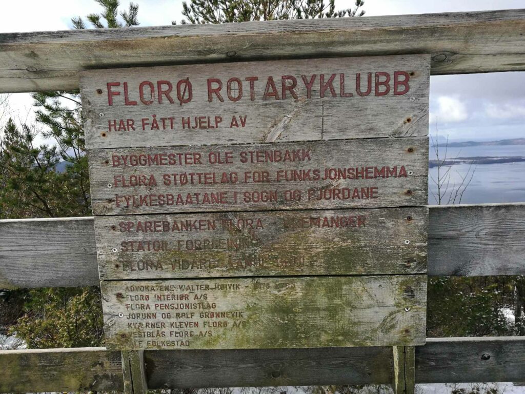 Det er en oppslagstavle her med opplysninger om turstiene, og en tavle som forteller om plattformen: Dette er et lokalt samarbeidsprosjekt, slik det er på sitt beste: Rotaryklubben ser ut til å være driveren, med alt fra pensjonistlaget, sparebanken og skolen som bidragsytere. Flora turlag har ruteoversikten, og kommunen driftsansvar.