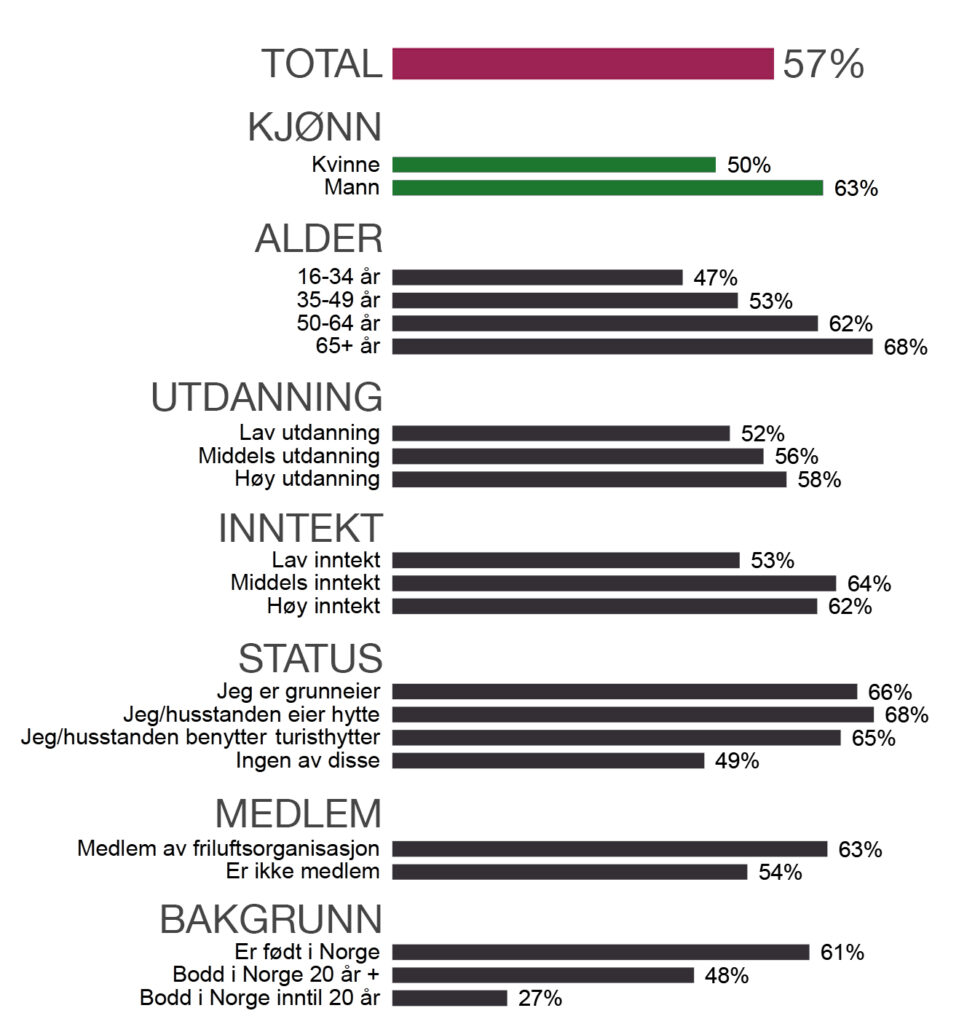 26 prosent svarer at de har hørt om allemannsretten, men ikke Friluftsloven: Undersøkelsen viser at denne gruppen i størst grad er kvinner, de har lav inntekt og er ikke medlem av noen friluftsorganisasjon.
