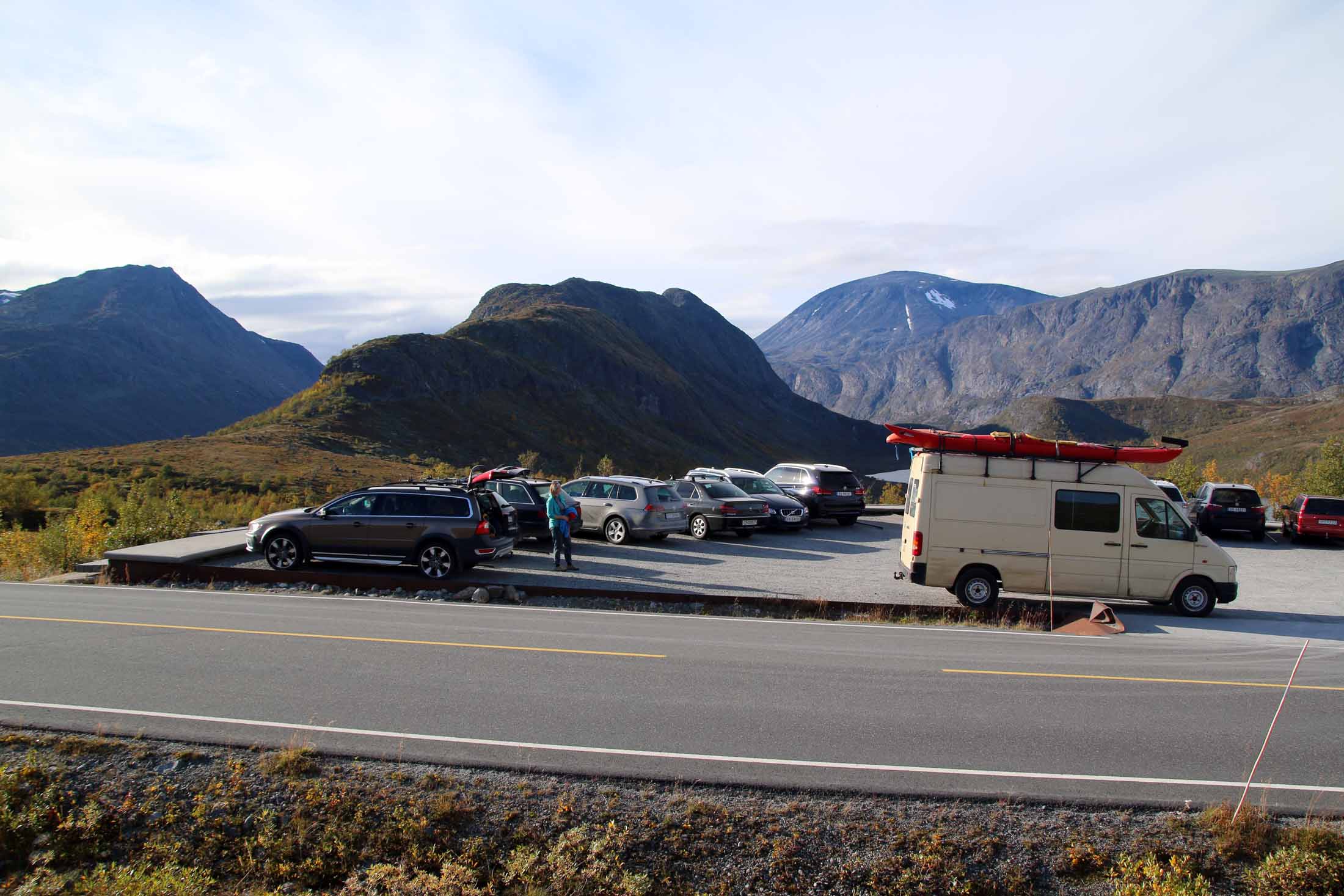 Bilen ble parkert på opparbeidet plass ved Vargebakken. Her starter stien, og første del går nedover til elva Varga, deretter oppover mot det første luftige innsteget til Knutshøe.