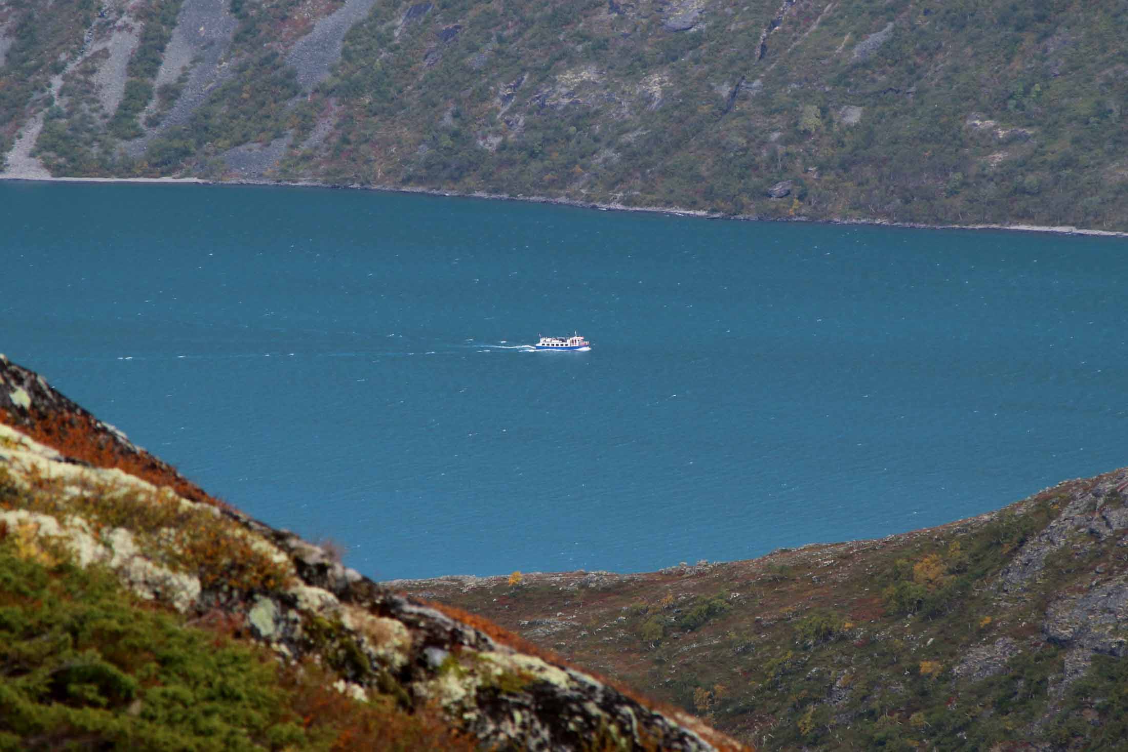 Vi fortsetter oppover, får fargerike Gjende til høyre, med båttrafikken – og etter ser etterhvert stien ned fra Veslfjellet til Gjendesheim. Så treffer vi på merket som viser at vi er i nasjonalpark, før det går lett utover.