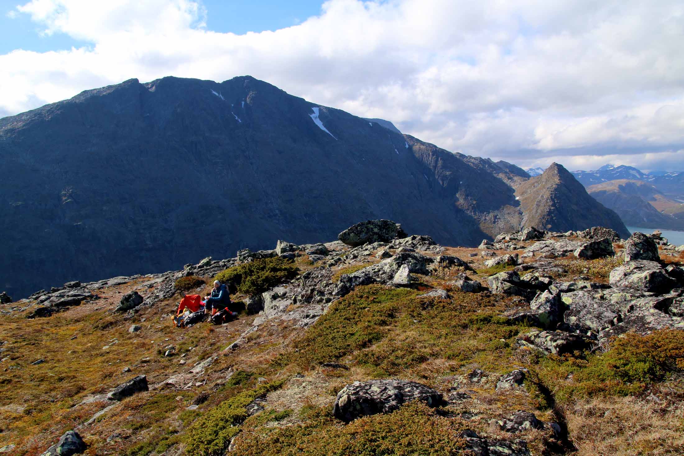 Det blåser her oppe, og vi går litt nedover før vi finner et punkt i le for vinden, for en god rast i lyngen før vi fortsetter videre. Nå ser vi for alvor trafikken opp Besseggen – på andre siden av Gjende – det myldrer av maur – i kø på vei opp. Og her er vi på Knutshøe, sammen med en noen få andre og har egentlig fjellet for oss selv.