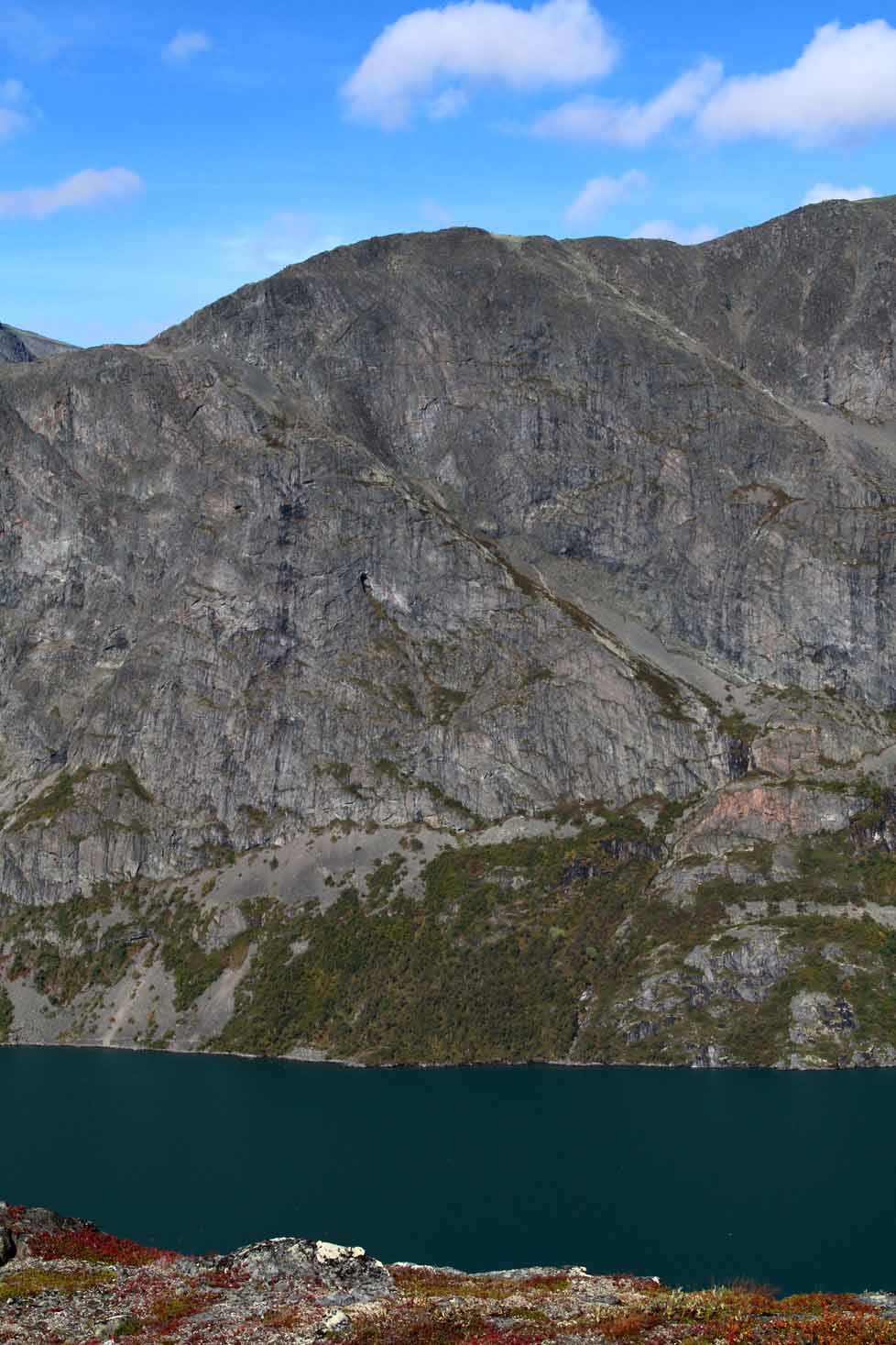 Vi ser bort på Besseggen – og Jo-stigen viser seg tydelig i fjellsida mot oss. Denne «snarveien» fra Gjende og opp på Besseggen er på ønskelista.