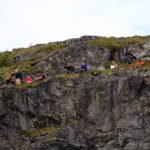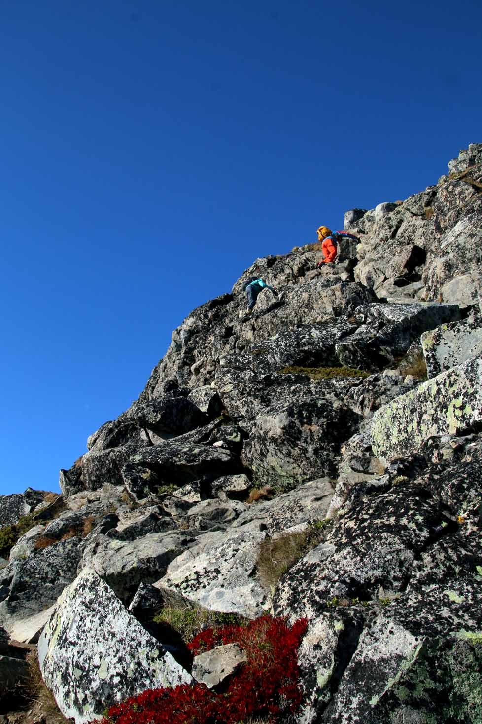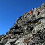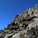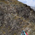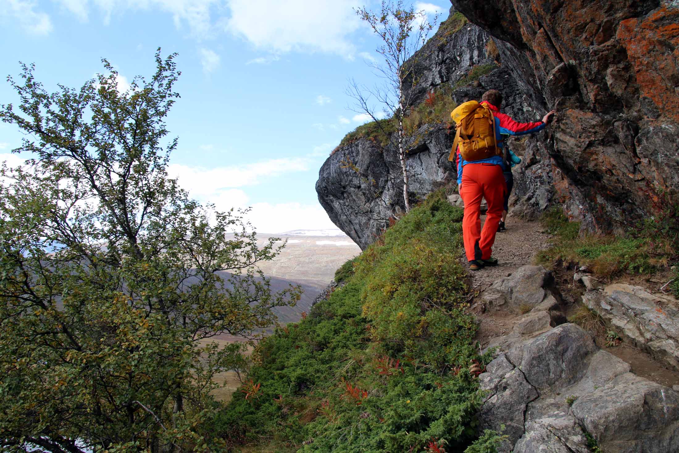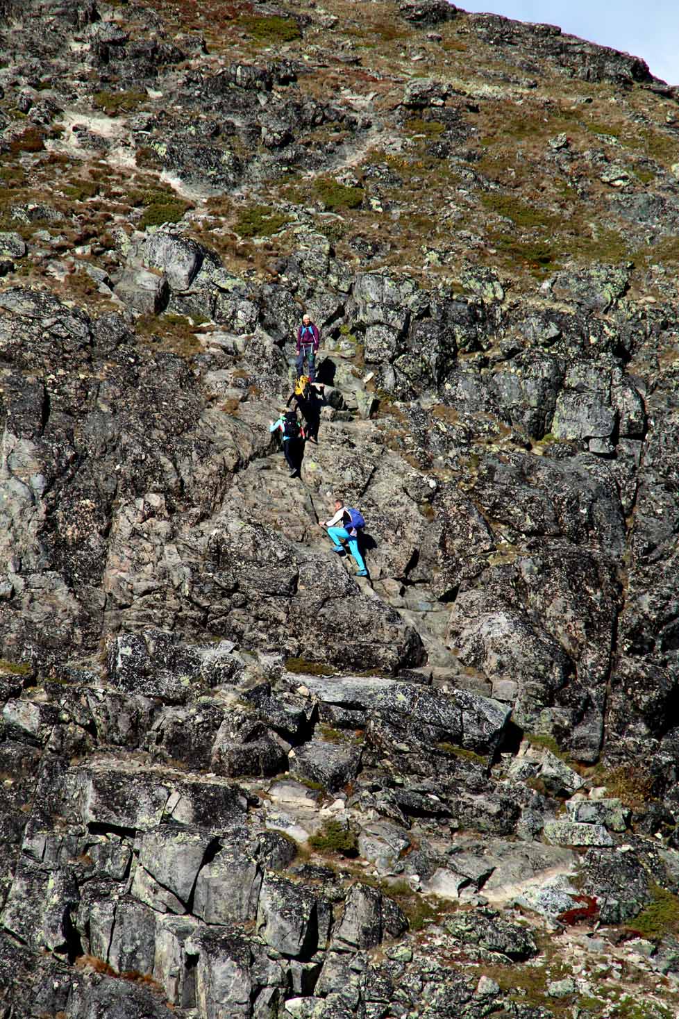 Snart er vi der selv, og vurderer ruta før vi begynner forsiktig på oppstigningen. Vi har det ikke travelt, og det er ingen grunn til å ta sjanser her. Det er lett klyving, men luftig nok. Er man ikke fokusert er det mulig at det går helt galt, har man høydeskrekk er det her man kjenner det. Dette partiet er minst like luftig som Besseggen, og det krever at man er tilstede i det man gjør.