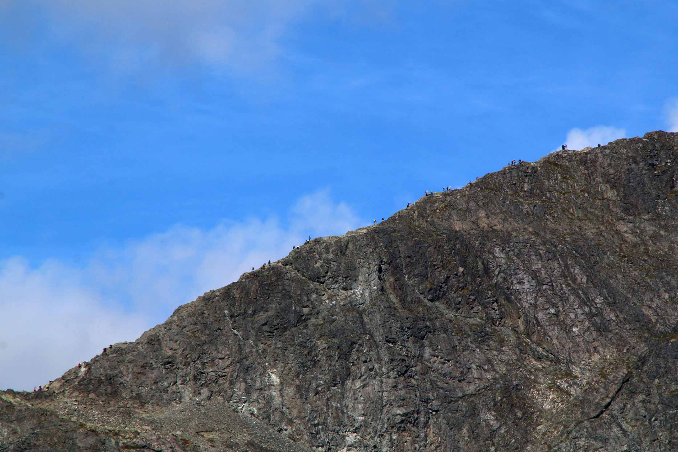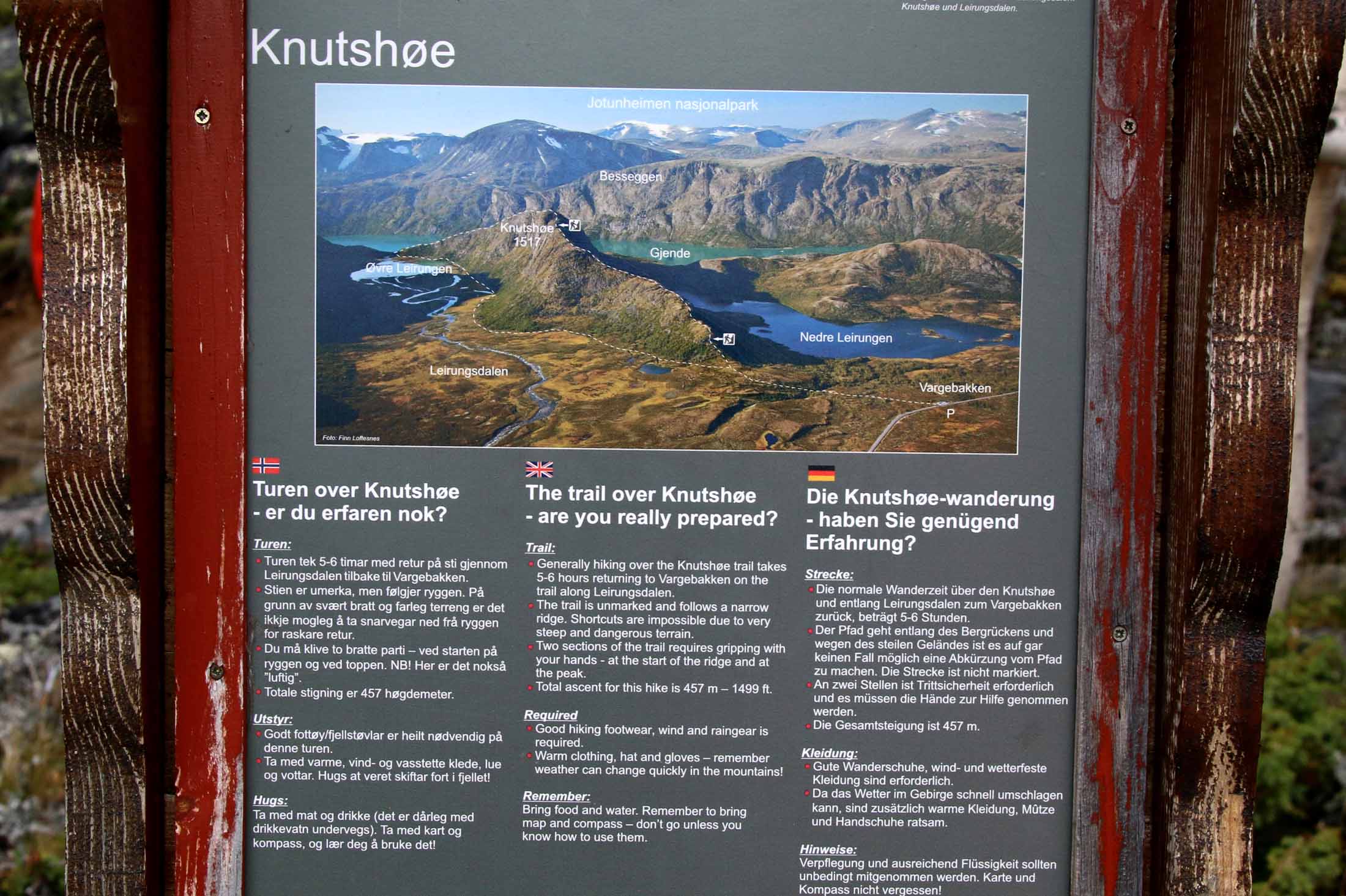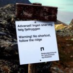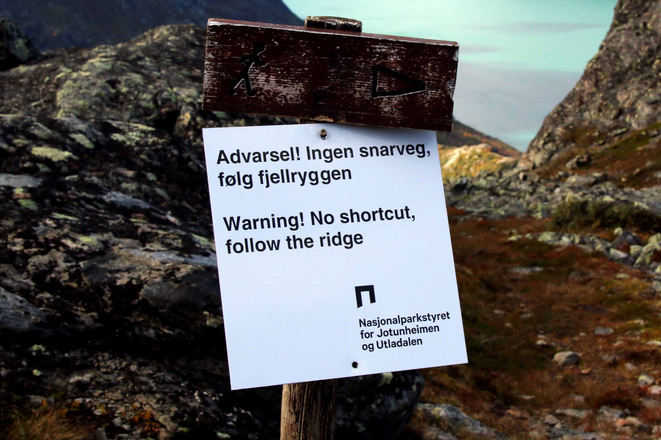 Videre treffer vi på et skilt fra Nasjonalparkstyret med påskriften «Advarsel! Ingen snarveg, følg fjellryggen. Warning! No shortcut, follow the ridge». I godvær er det fin humor, som lokker fram smilet hos oss. I dårlig vær kan det være forskjellen på liv og død.