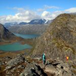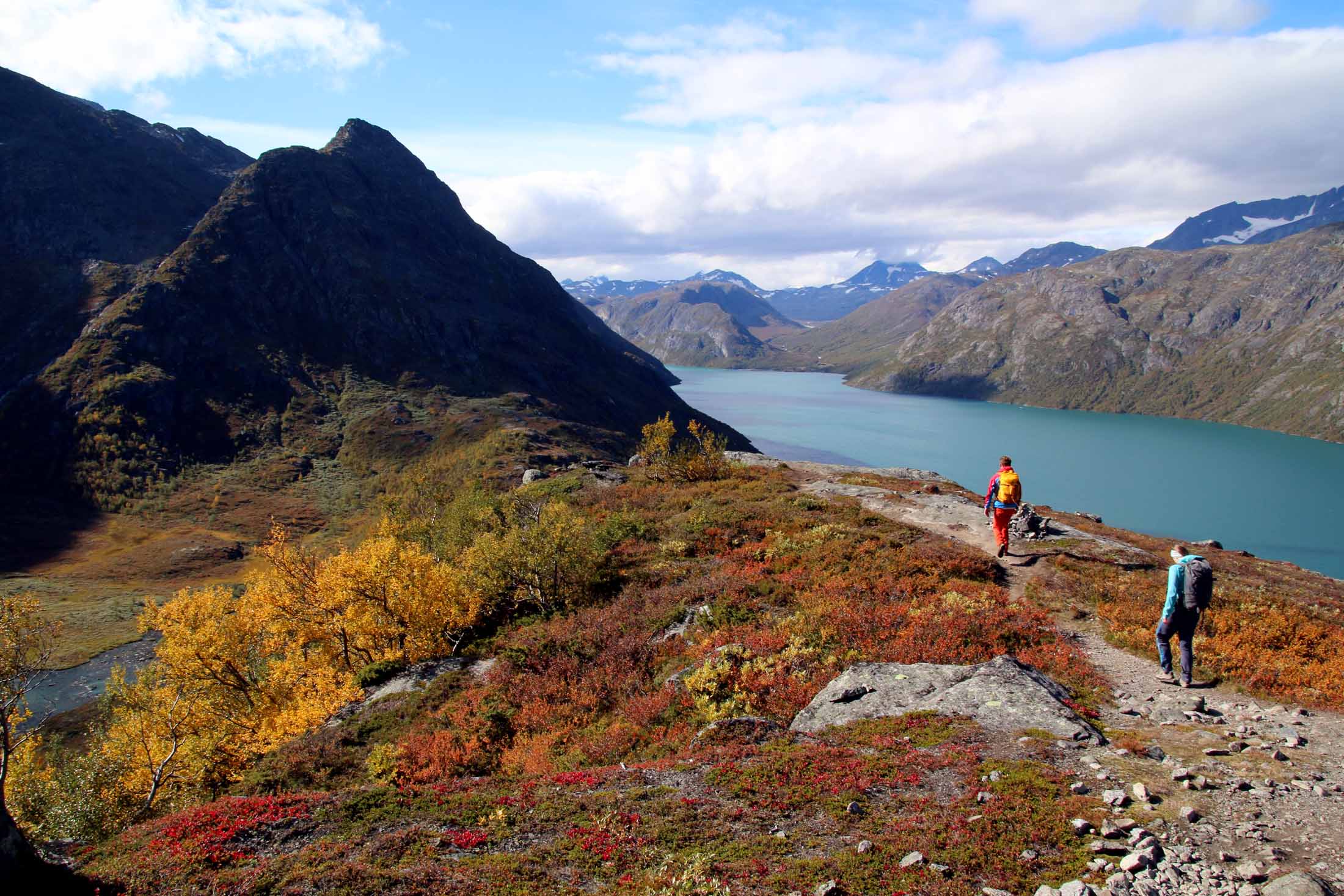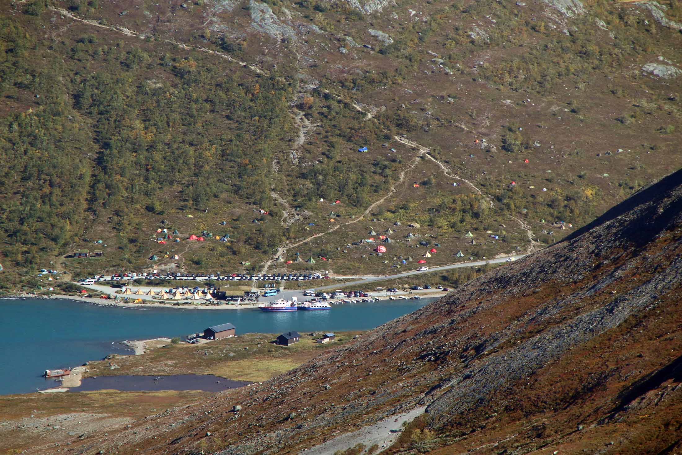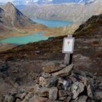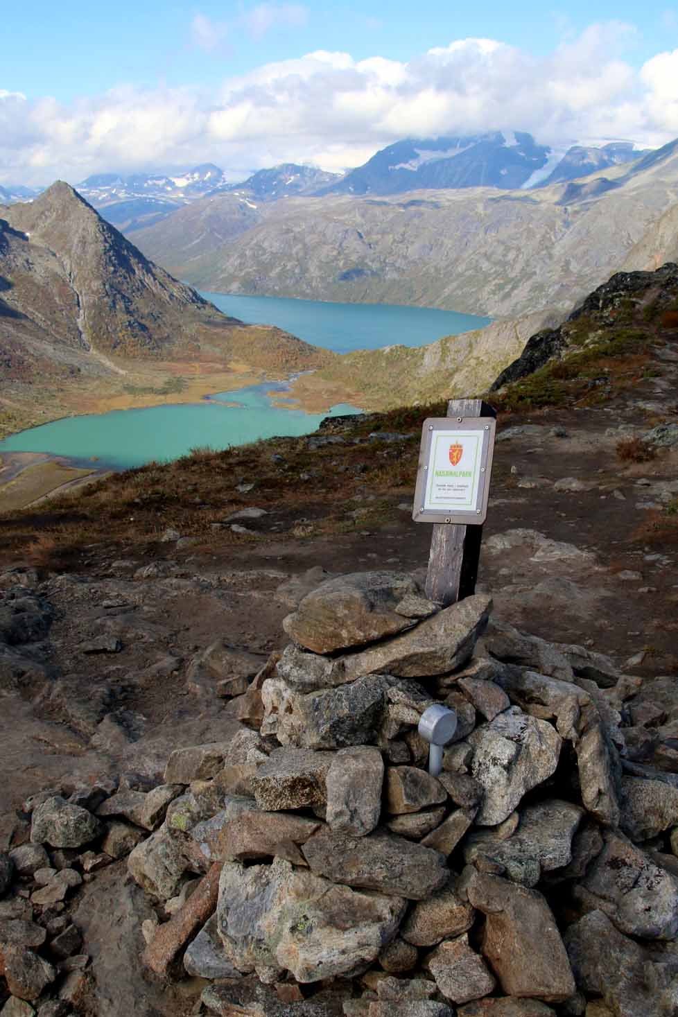 Vi fortsetter oppover, får fargerike Gjende til høyre, med båttrafikken – og etter ser etterhvert stien ned fra Veslfjellet til Gjendesheim. Så treffer vi på merket som viser at vi er i nasjonalpark, før det går lett utover. Snart ser vi det neste luftige punktet midt imot. Det er folk på vei opp, og det er tydelig at de tar det med ro.