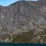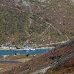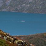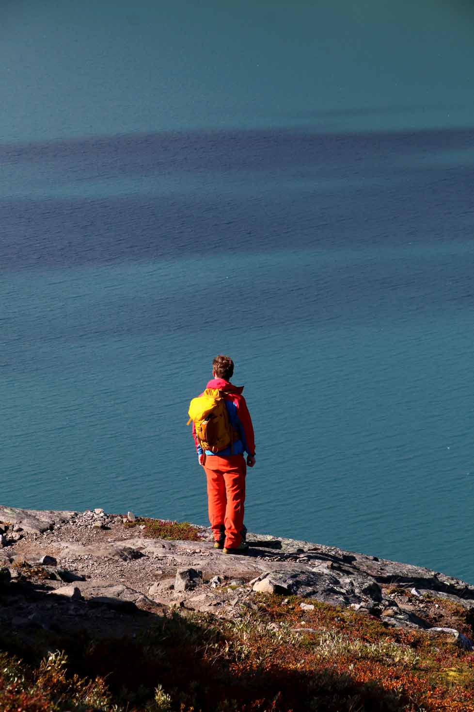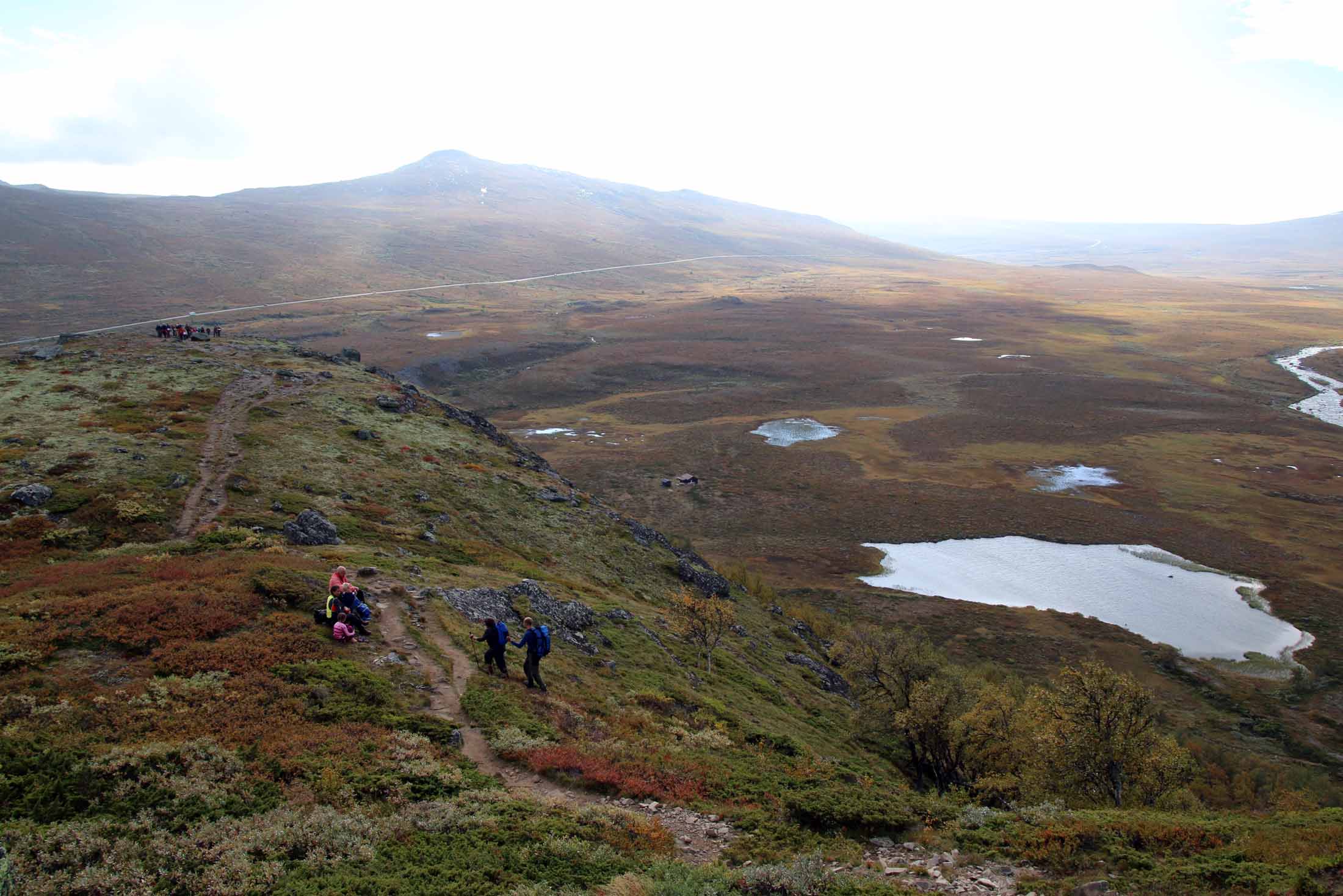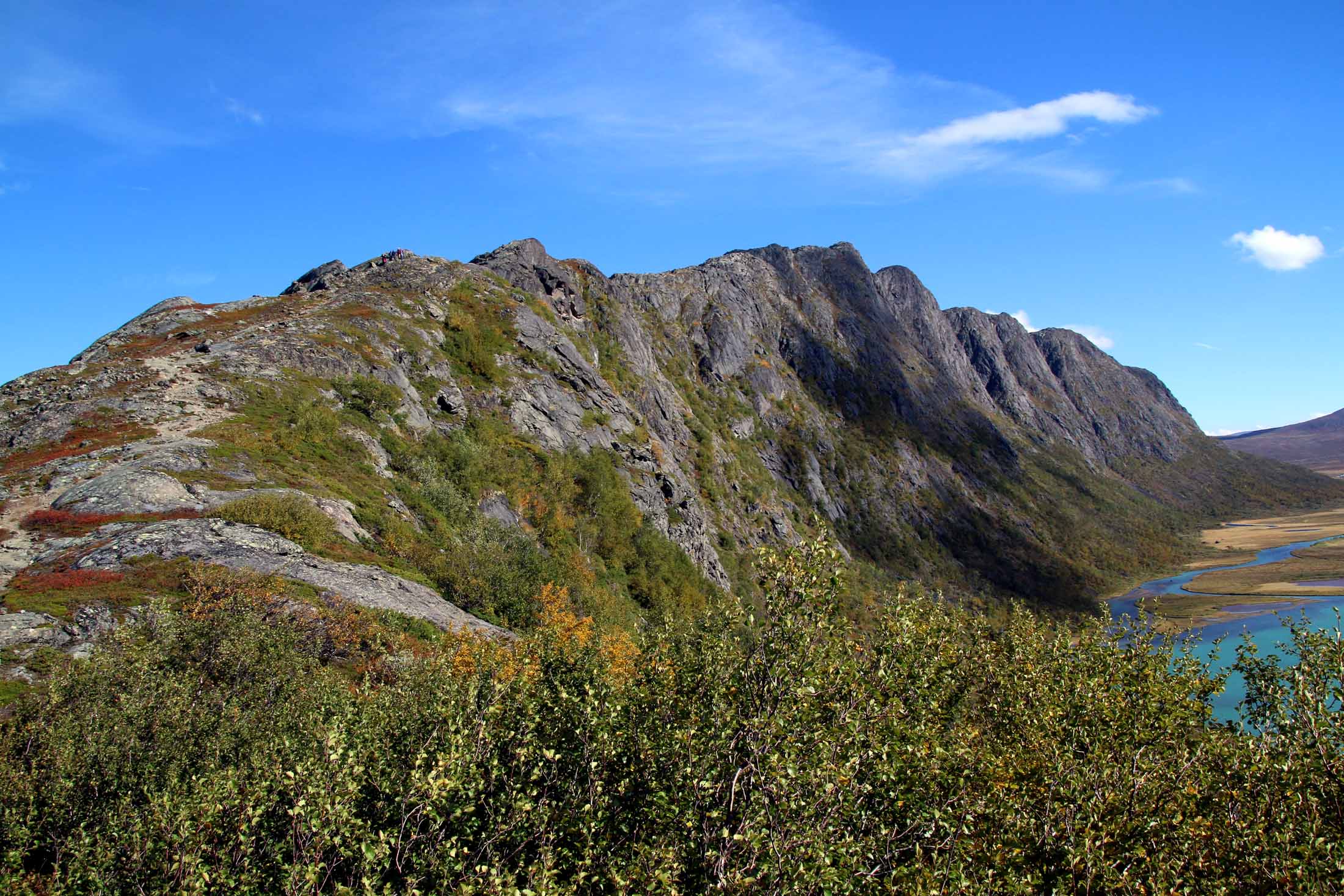 Vi fortsetter oppover, får fargerike Gjende til høyre, med båttrafikken – og etter ser etterhvert stien ned fra Veslfjellet til Gjendesheim. Så treffer vi på merket som viser at vi er i nasjonalpark, før det går lett utover. Snart ser vi det neste luftige punktet midt imot. Det er folk på vei opp, og det er tydelig at de tar det med ro.