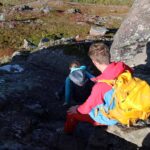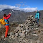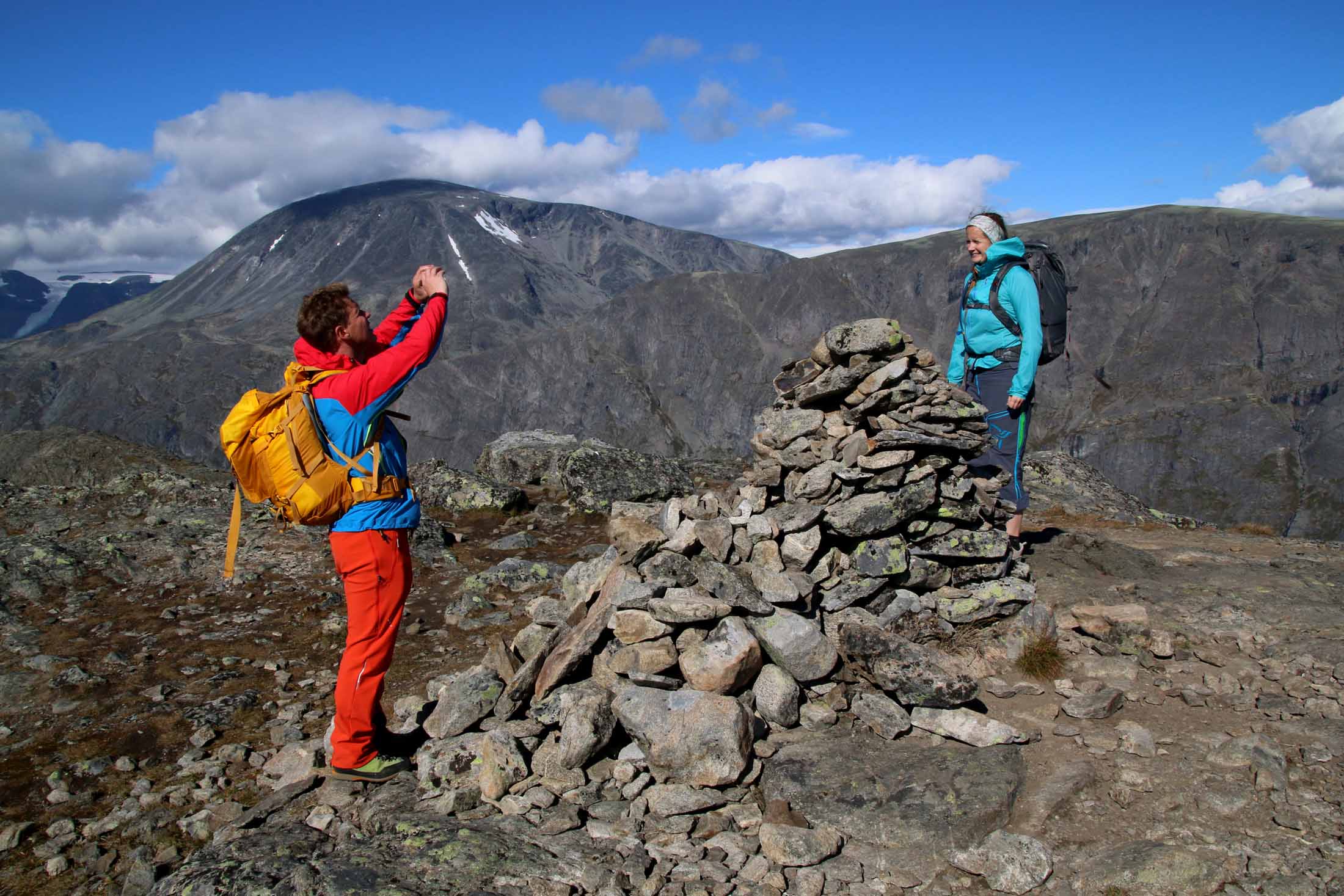 Vi klyver opp, stein for stein, med små pauser innimellom, og snart er vi oppe – og varden ønsker oss velkommen til Knutshøes høyeste punkt – 1517 meter over havet.