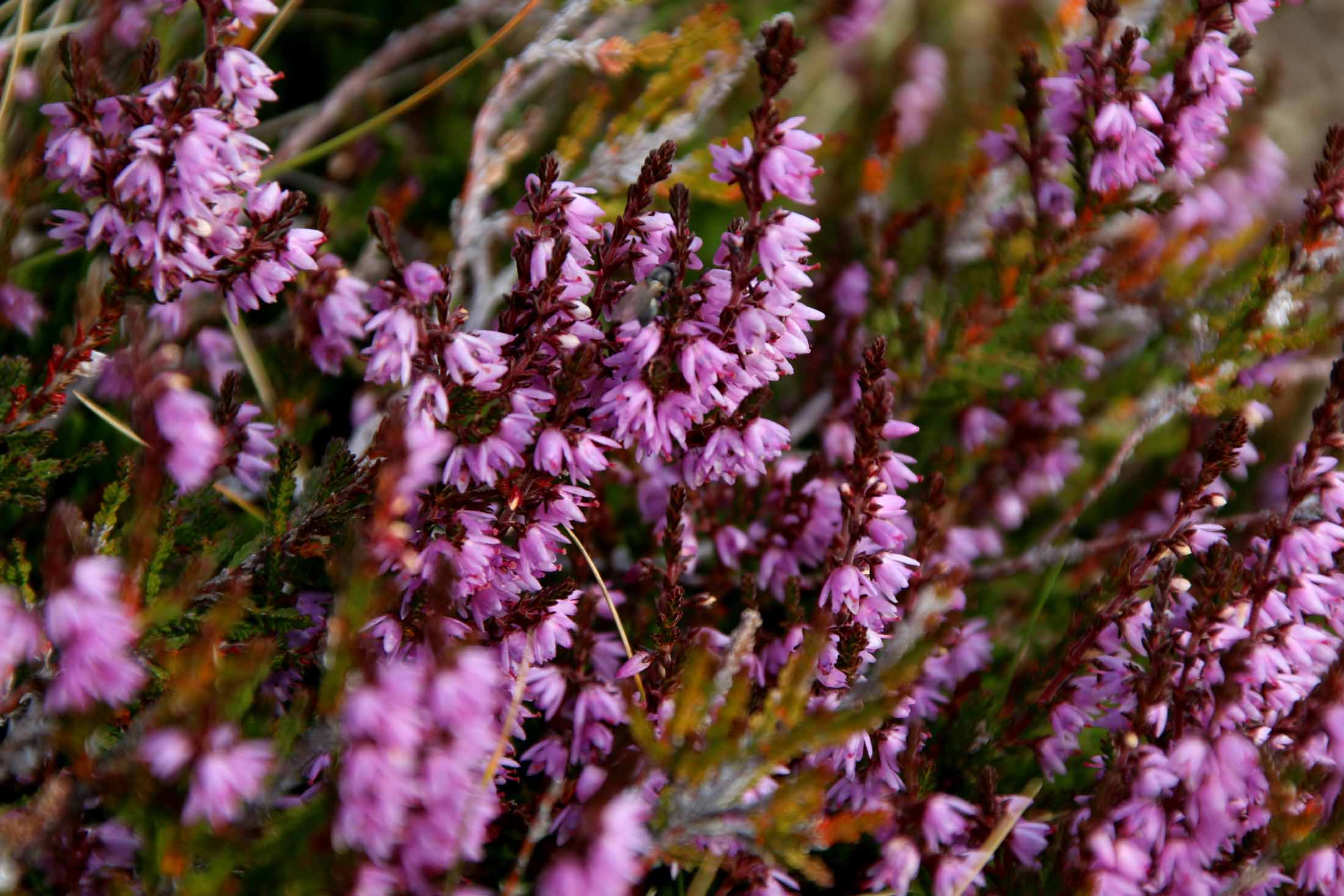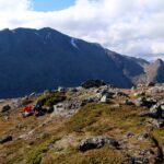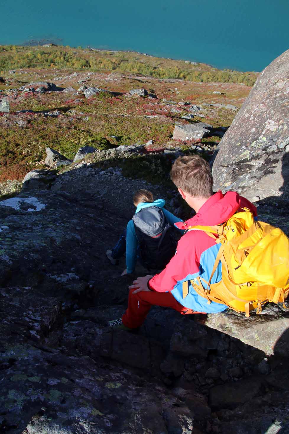 Det blåser her oppe, og vi går litt nedover før vi finner et punkt i le for vinden, for en god rast i lyngen før vi fortsetter videre. Nå ser vi for alvor trafikken opp Besseggen – på andre siden av Gjende – det myldrer av maur – i kø på vei opp. Og her er vi på Knutshøe, sammen med en håndfull andre og har egentlig fjellet for oss selv.
