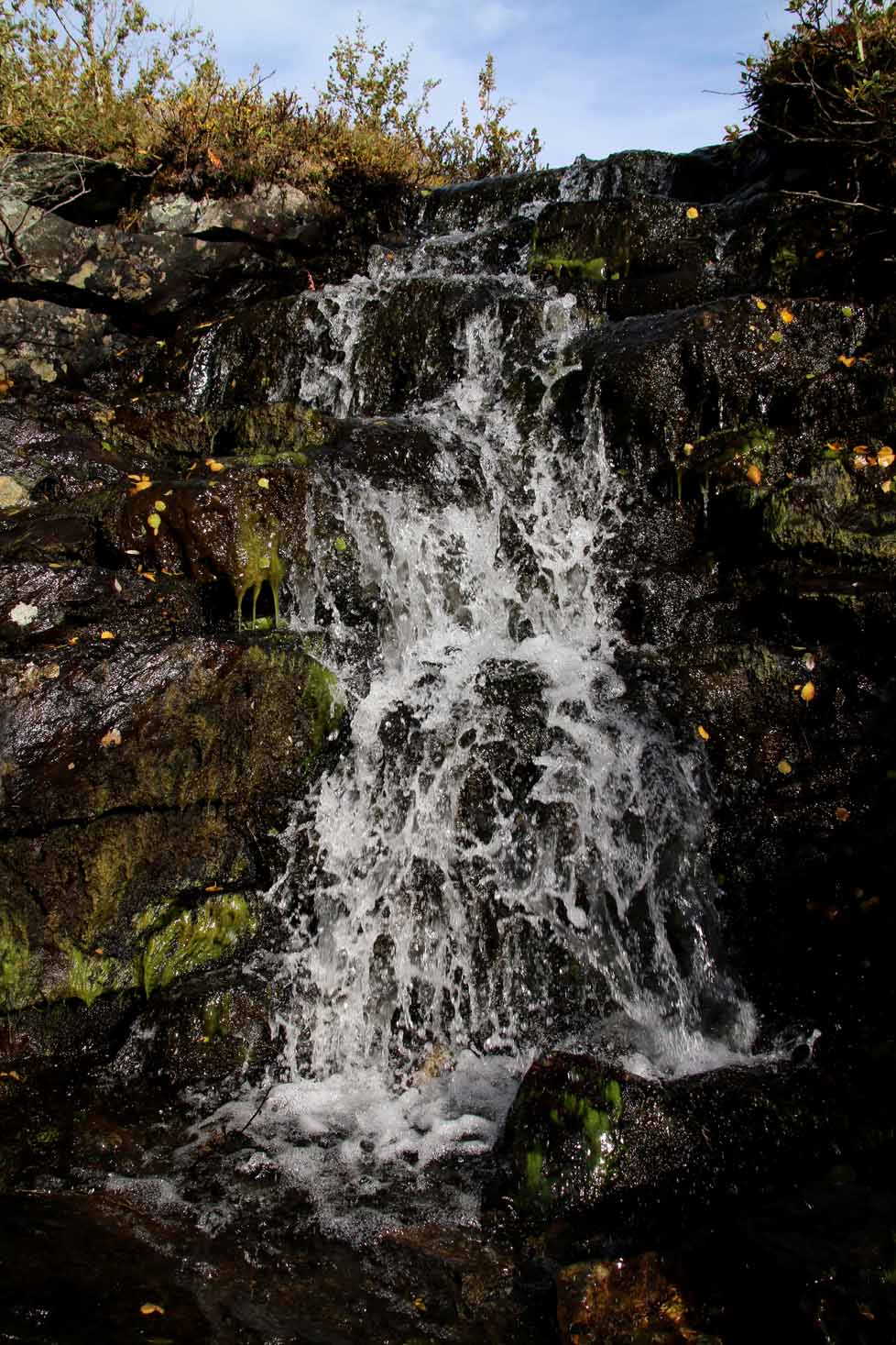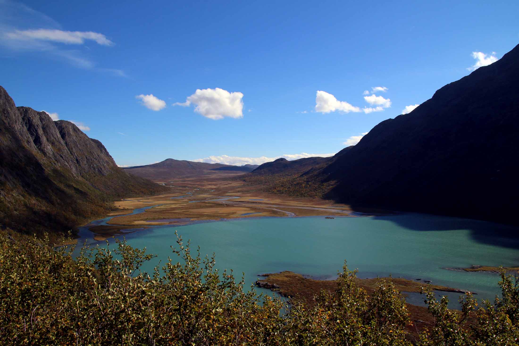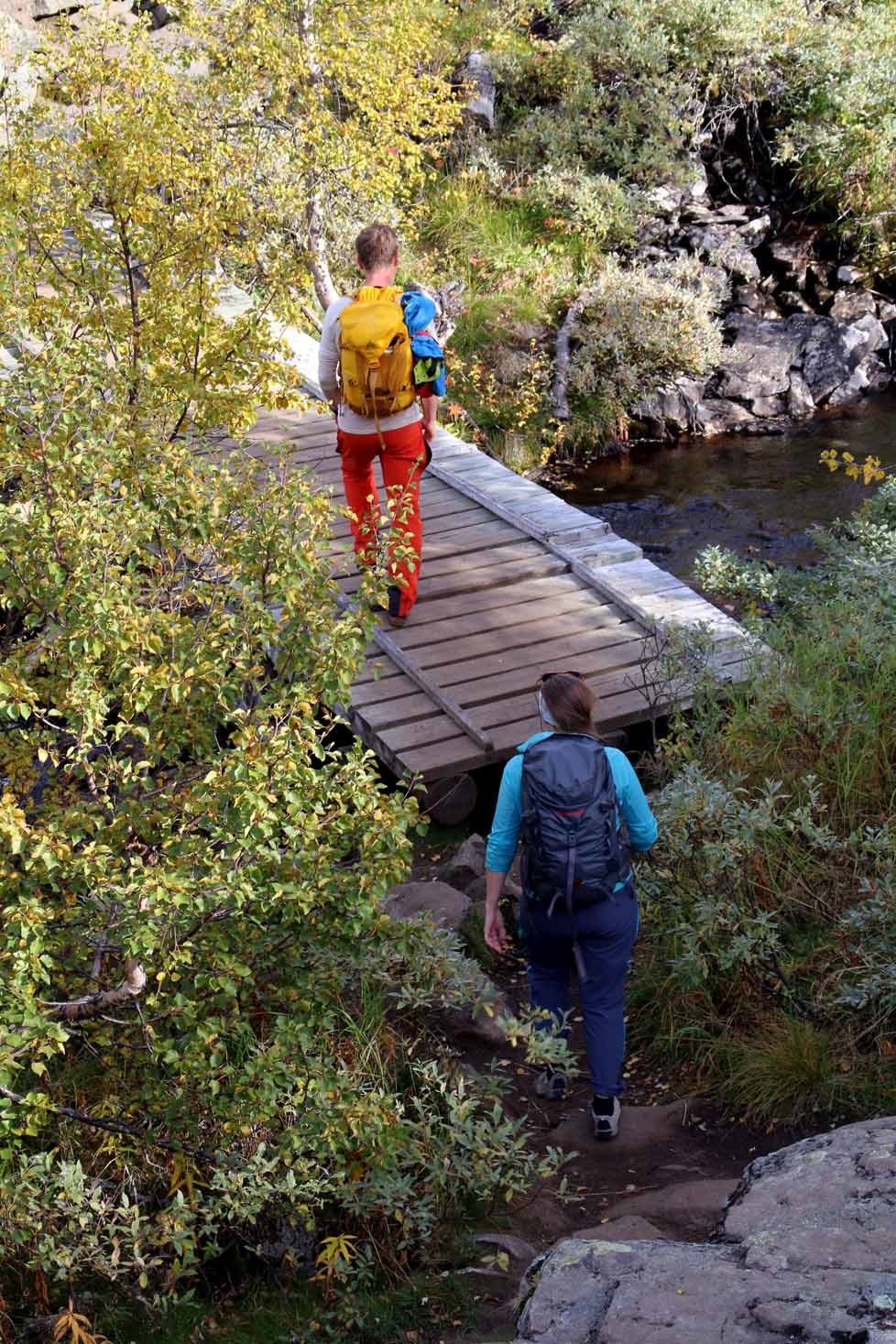Turen ut er en drøm i en frodig del av dette fjellområdet. Sola varmer fortsatt – og vi tar både nødvendige og unødvendige stopp på vei ut.
