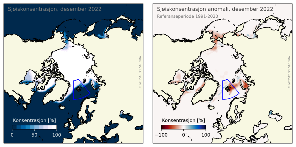 Til venstre: Sjøiskonsentrasjonen i Arktis for desember 2022. Blått er åpent hav, mens hvitt er 100 % is. Til høyre: avvik i prosent av iskonsentrasjonen fra normalperioden 1991-2020. Røde områder har mindre is enn normalt, mens blå har mer. Figur: Meteorologisk institutt