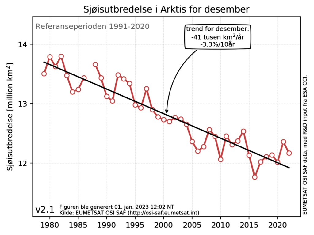 Utbredelsen av sjøis i Arktis for desember er den åttende laveste utbredelse som har blitt observert for desember med satellittmålinger. Utbredelsen er er lav i forhold til normalperioden 1991-2020 for desember, melder Meteorologisk institutt i en pressemelding.