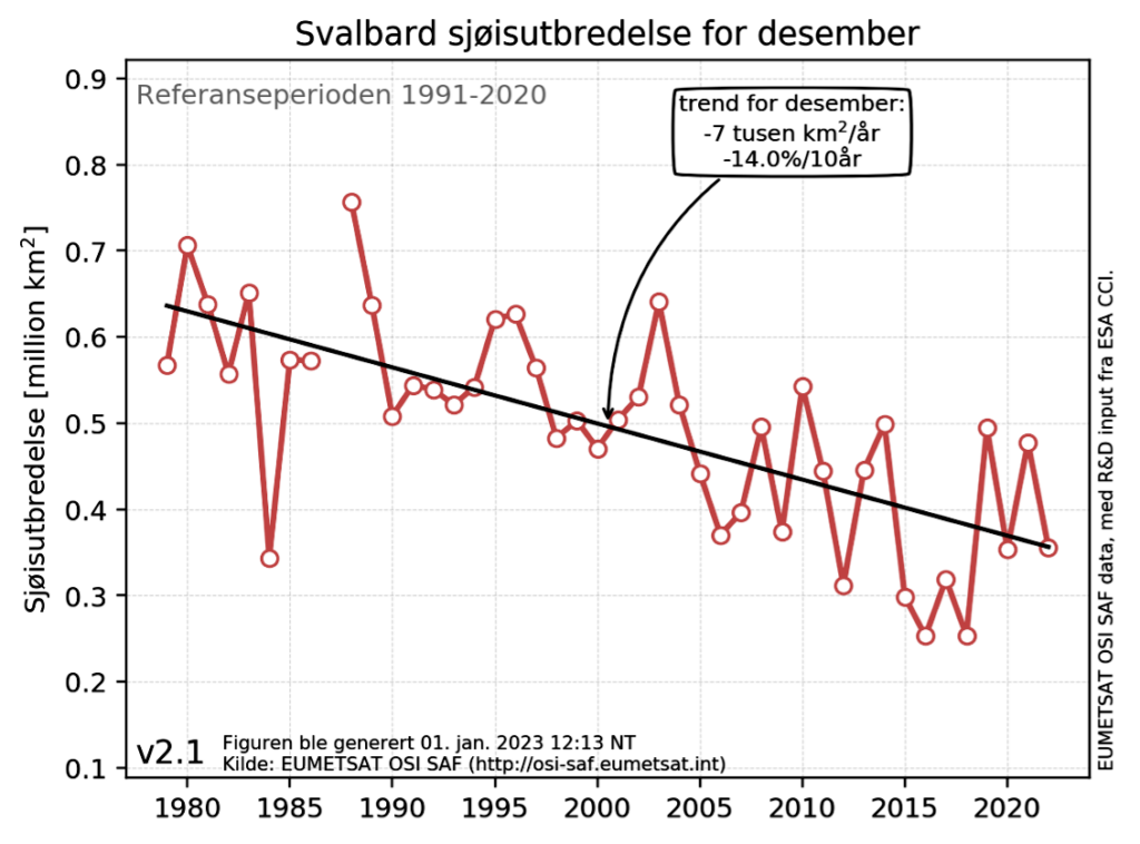 Rundt Svalbard er sjøisutbredelsen lavere enn «normalt» i forhold til 1991-2020, og er også blant de åtte laveste observert i dette området for desember. Det er hovedsakelig øst for Svalbard at det mangler sjøis i forhold til normalen.